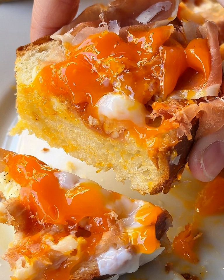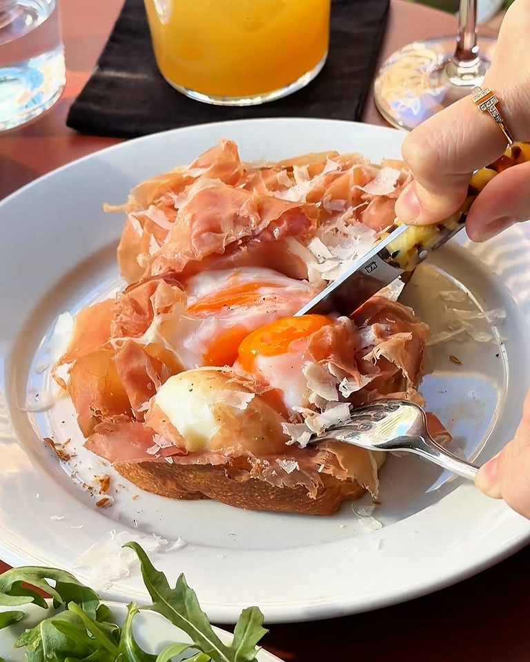 半熟卵を絡めた生ハムがふわふわの生地によく合います。