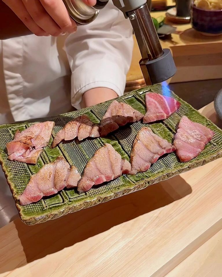 - 炙って甘みの増した大トロと赤身のマグロ巻きから始まる、丁寧に仕込まれた握り15種類のコースが11000円