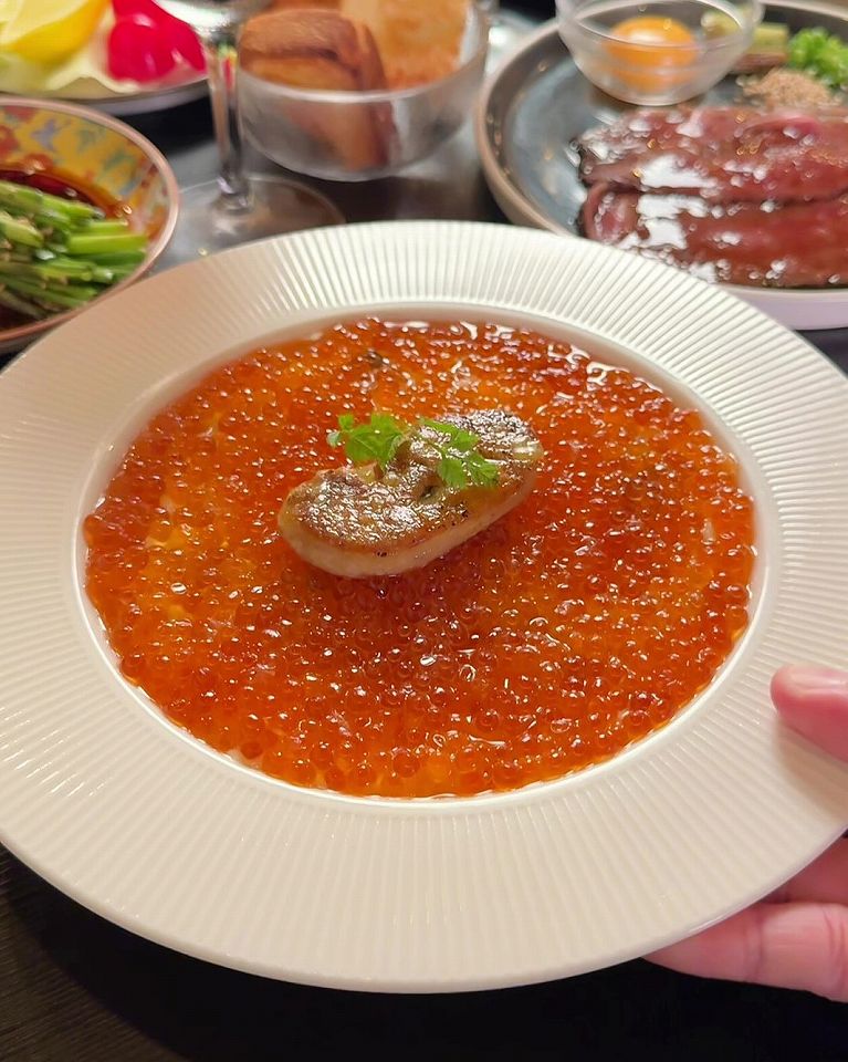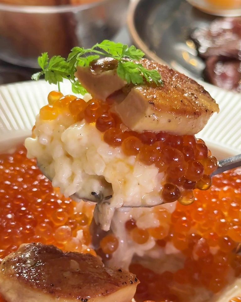 2024年7月に高円寺にオープンした「ばか同士。」は、A4黒毛和牛ロースの焼きすきなど、肉料理が得意なお店ですが、このフォアグラとイクラのリゾットは絶対食べてほしい目玉商品です。
