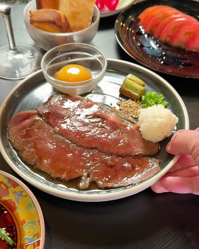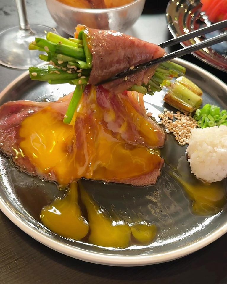 - A4黒毛和牛ロースの焼きすきは、とってもレアな火通りで食感の良いネギと一緒に食べたら絶品