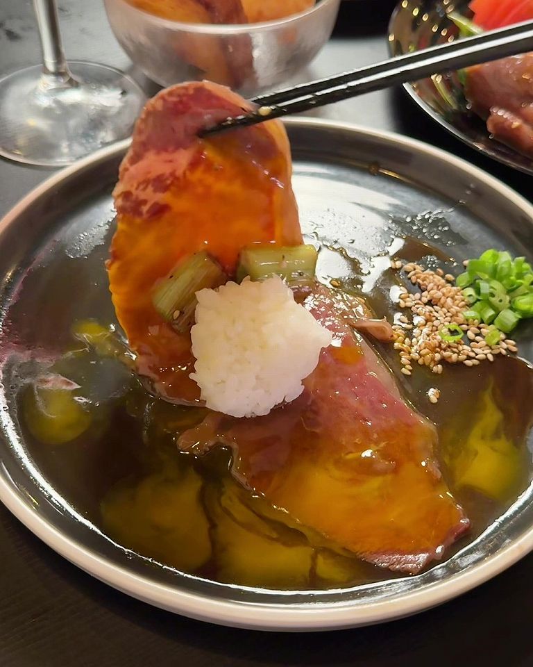 「A4黒毛和牛ロースの焼きすき」はとってもレアな火通りで、食感の良いネギと一緒に食べたら、とろけるお肉とザクザクのネギの食感のコントラストが心地よくて絶品でした!