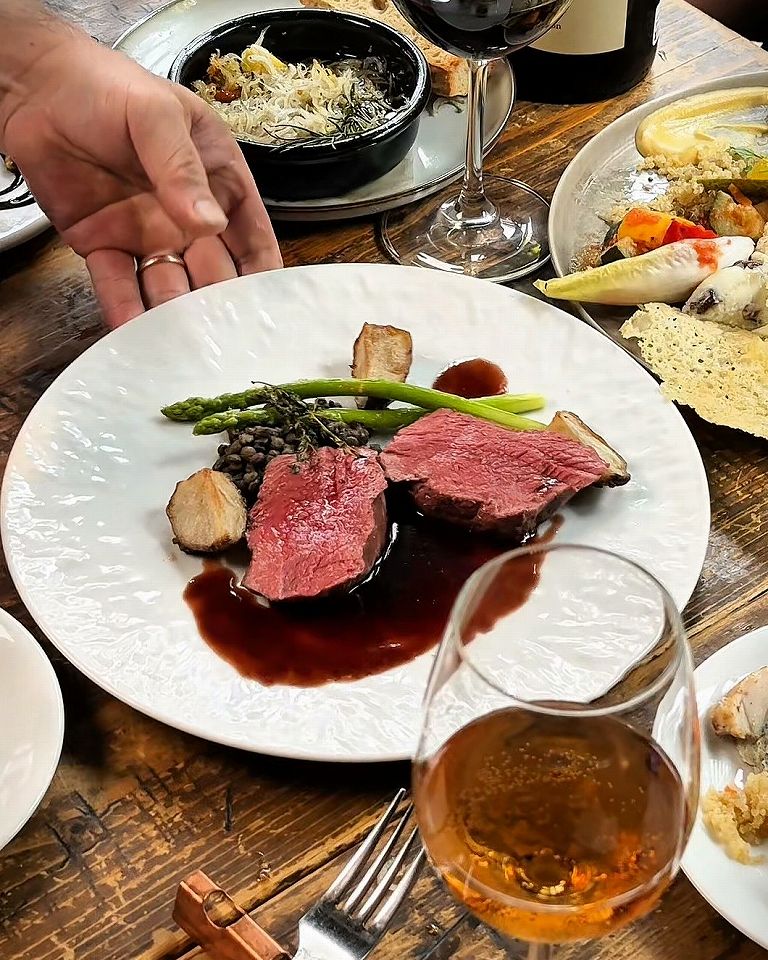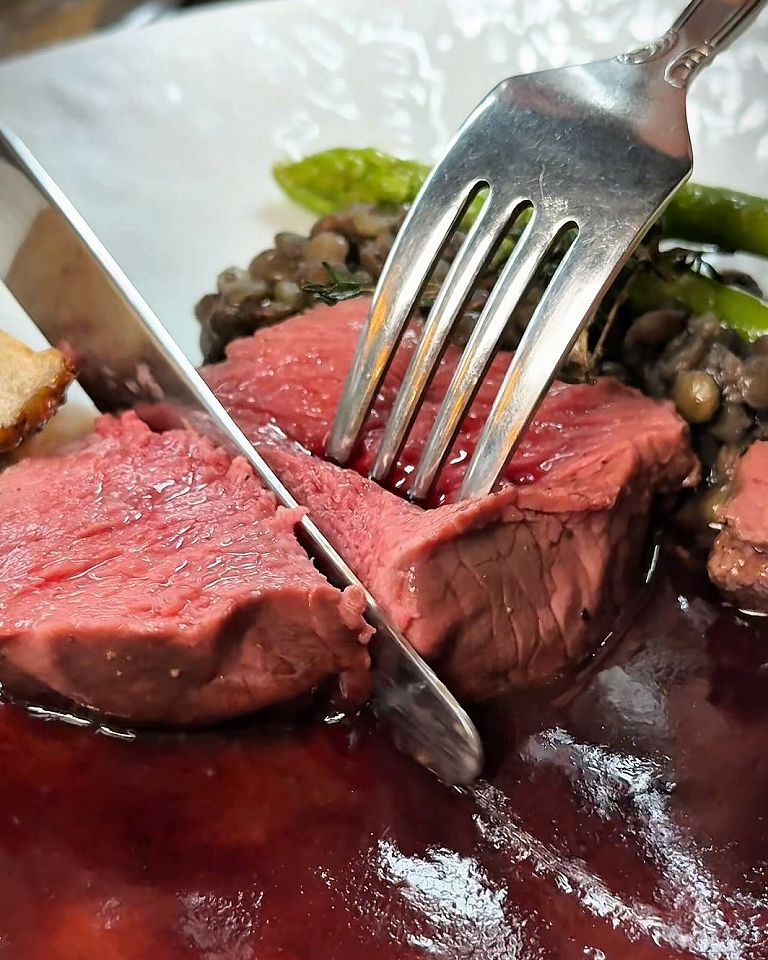• 北海道から届く蝦夷鹿のロースは絶妙な火入れで、旨味の強い赤身肉とワインのマリアージュは最高すぎる