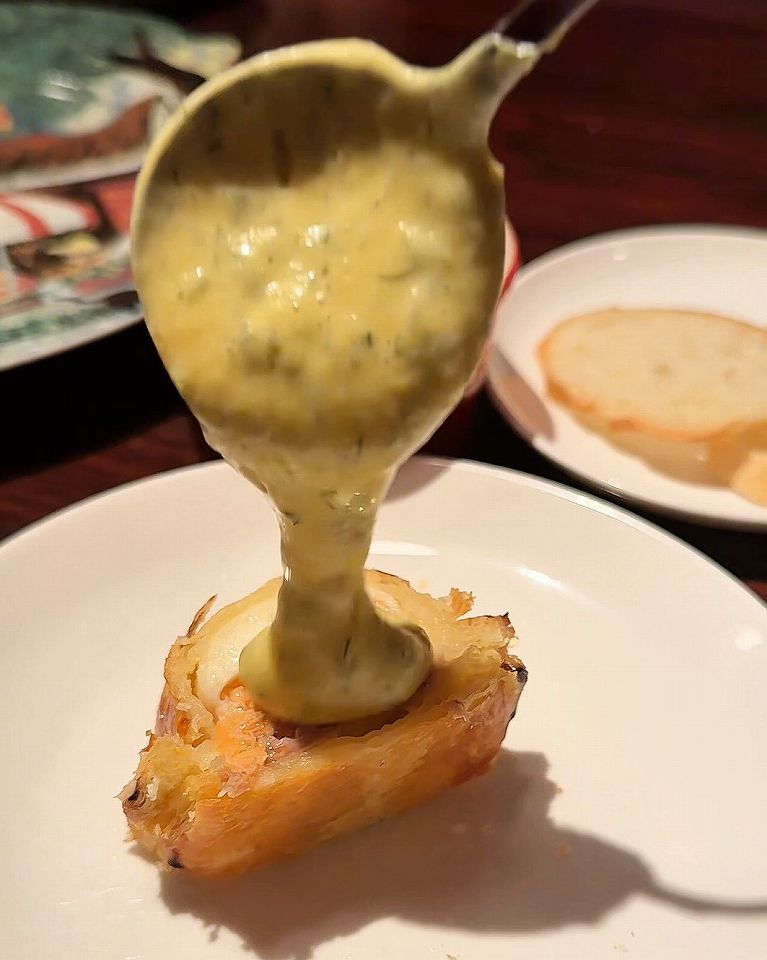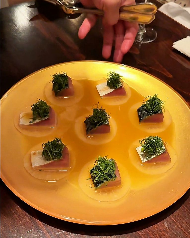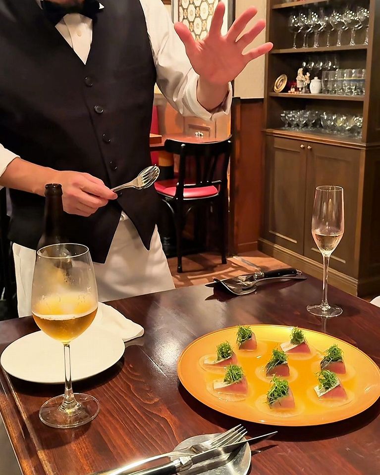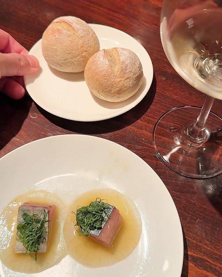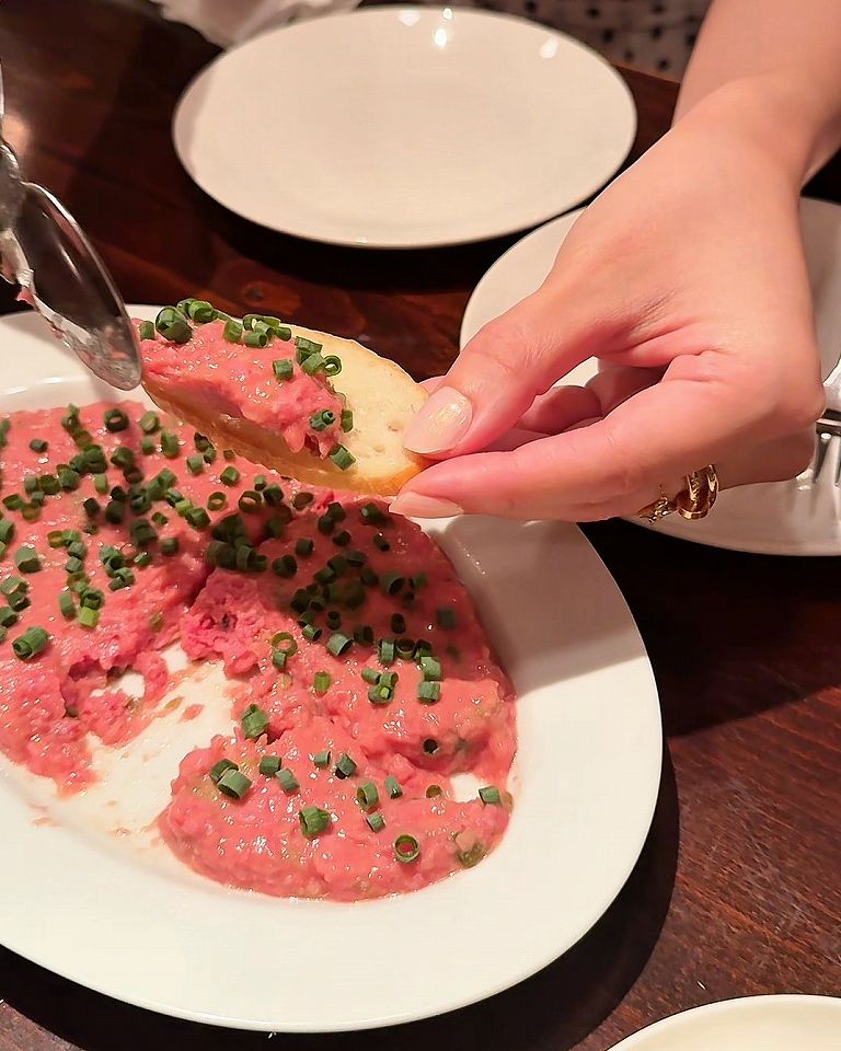 次は黒毛和牛のタルタルです。エシャロットにケッパー、マスタードなどで味付けされていて恐ろしく美味いです…。パンに乗せて食べたらもう病みつきになります。