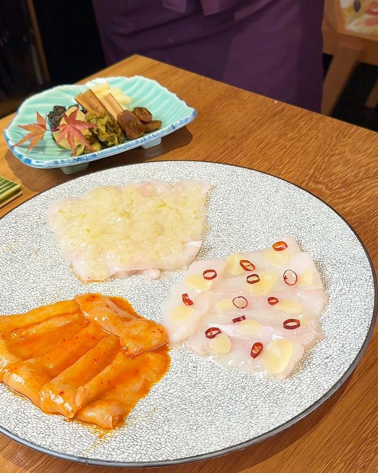 そして、これがこの店名物の焼き虎ふぐ(「焼きふぐ 上身3種盛り」3800円)です。