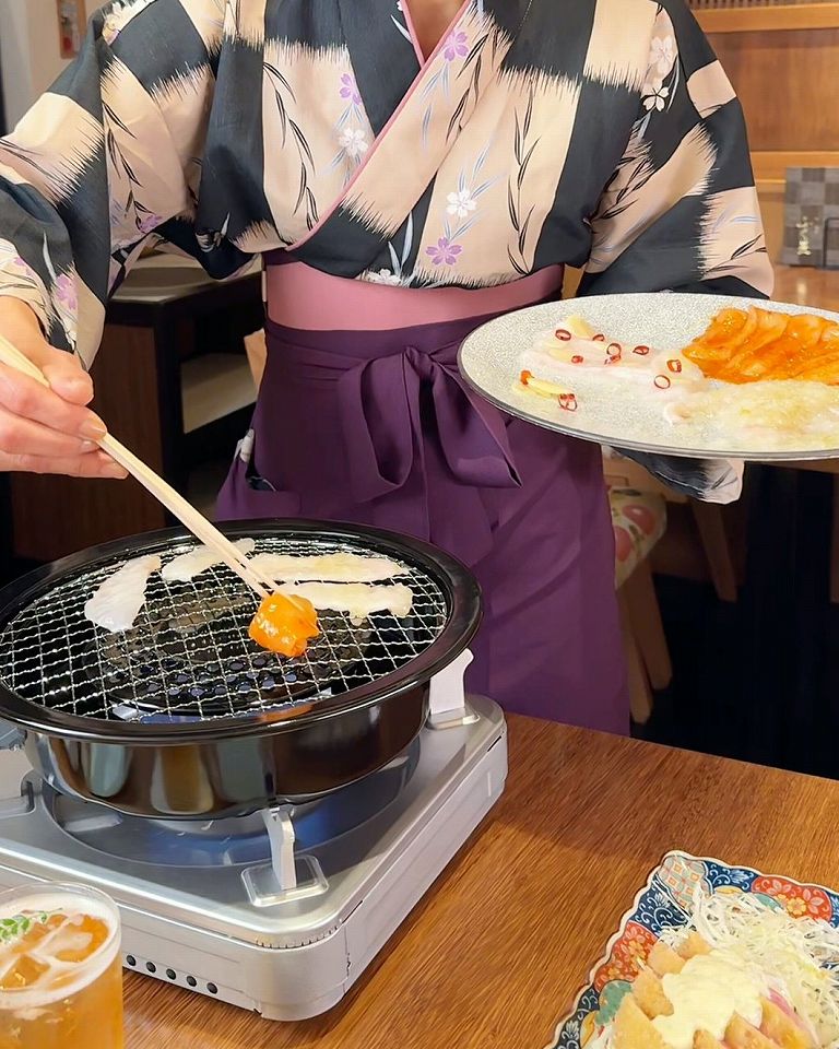 • フグも焼肉も一皿からフルアテンドで焼いてくれる