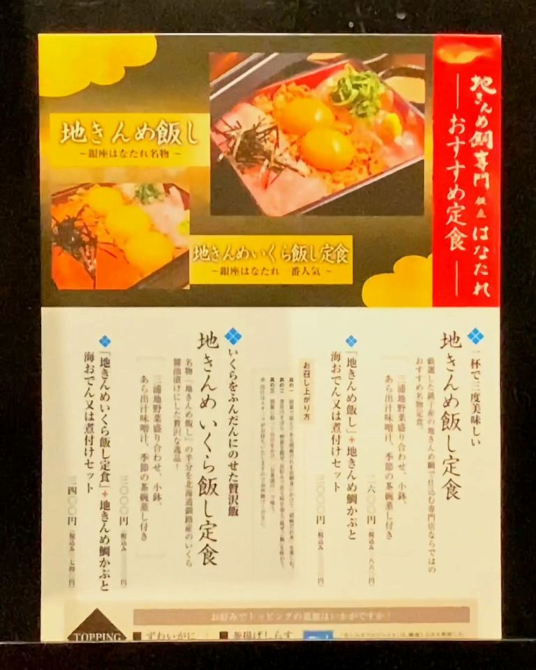 鮪 専門 銀座はなたれでの定食は他にも、「日替わり海鮮地きんめ飯し定食」や平日限定の「生本まぐろと中トロを使った地きんめねぎとろ飯し」に加えて、トッピングで「ずわいがに」や「釜揚げしらす」なども楽しめます。