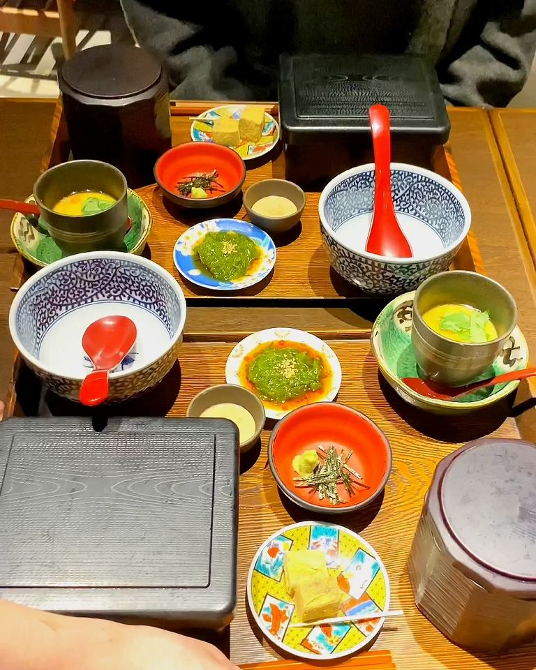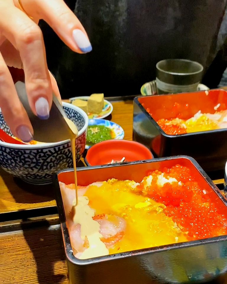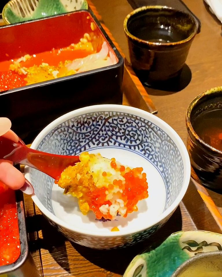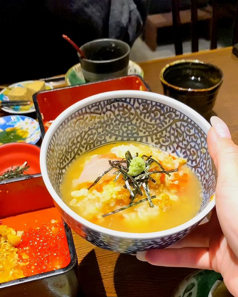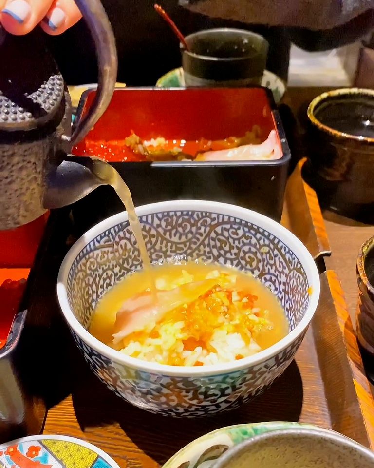 最後は出汁をかけて薬味を乗せたら、出汁茶漬けにして食べられます。温かい出汁が素材の旨みを引き立てて、ほっとする美味しさが楽しめます。最後まで飽きない贅沢な美味しさでした!