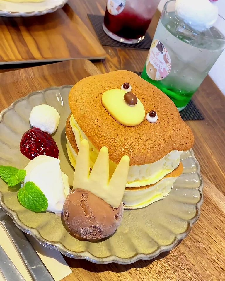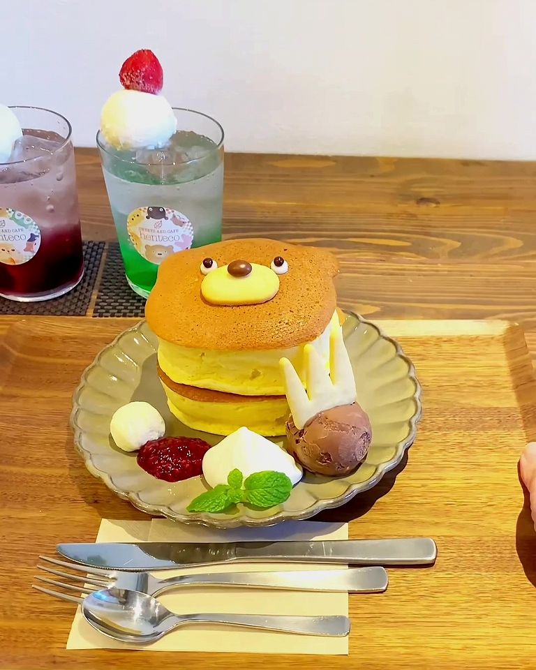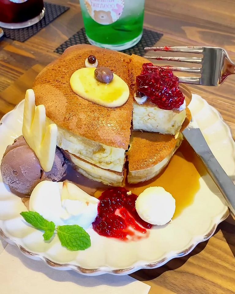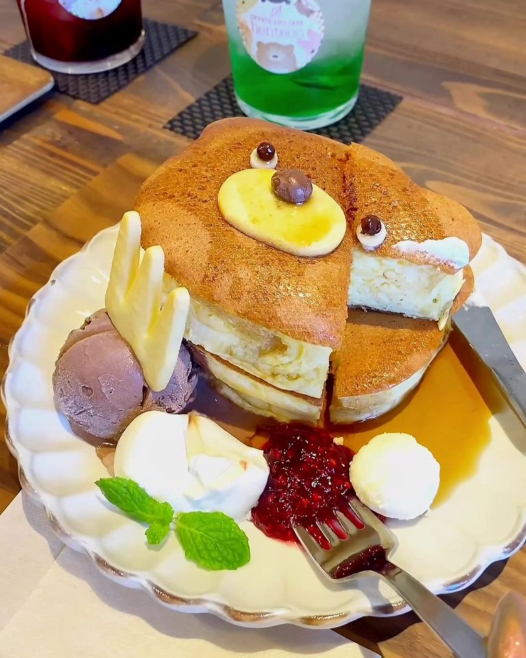 熊の形をしたプルプル、ふわふわの厚焼きの生地が二段乗っていて、可愛くてなかなか切れないです! 食べてみると、程よい甘さでこんなにふわふわなのに食感はしっかりしています!可愛すぎて食べるのもちょっともったいなく感じてしまいますよね。