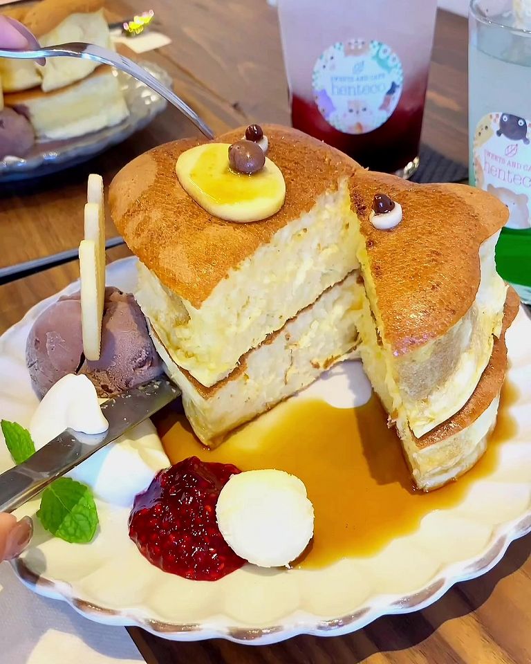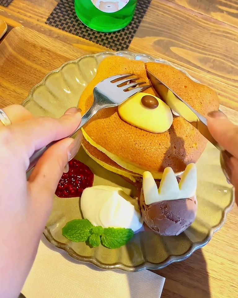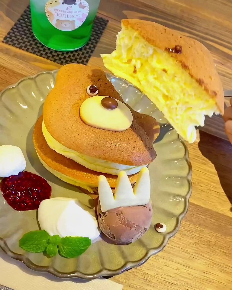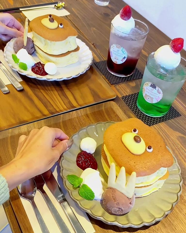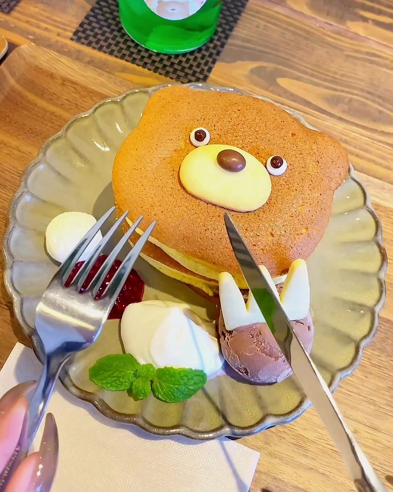 熊の形をしたプルプル、ふわふわの厚焼きの生地が二段乗っていて、可愛くてなかなか切れないです! 食べてみると、程よい甘さでこんなにふわふわなのに食感はしっかりしています!可愛すぎて食べるのもちょっともったいなく感じてしまいますよね。