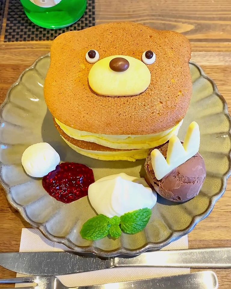 熊の形をしたプルプル、ふわふわの厚焼きの生地が二段乗っていて、可愛くてなかなか切れないです! 食べてみると、程よい甘さでこんなにふわふわなのに食感はしっかりしています!可愛すぎて食べるのもちょっともったいなく感じてしまいますよね。