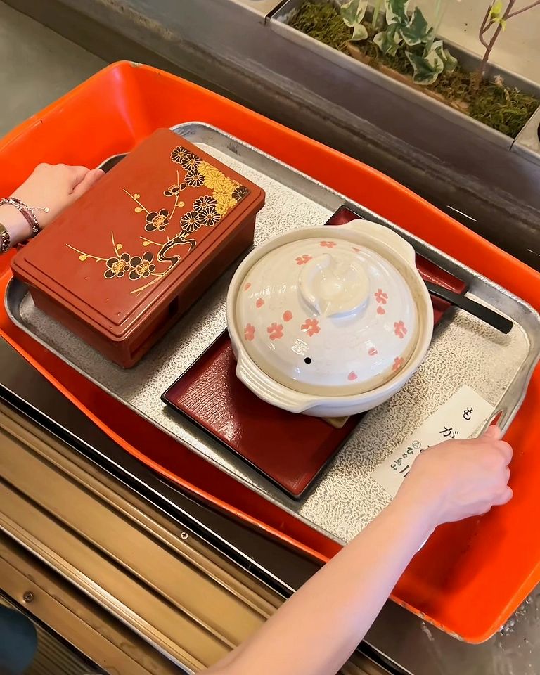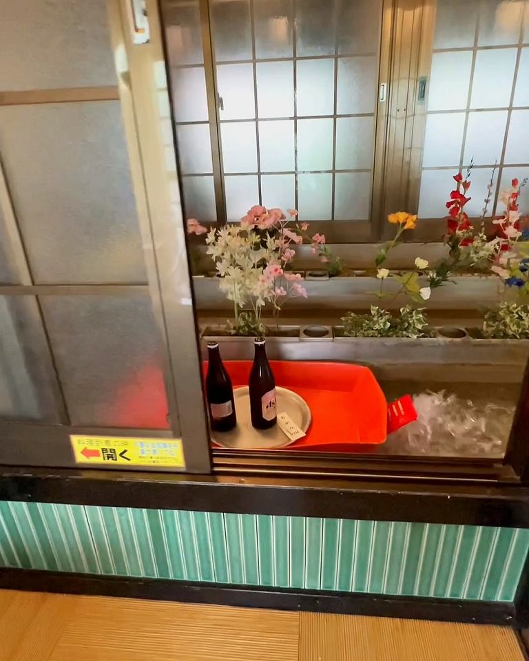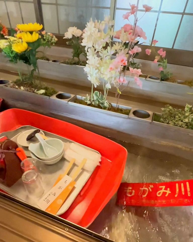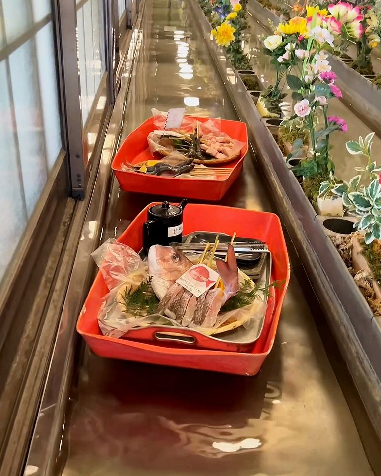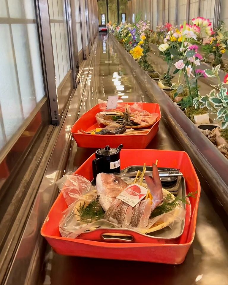 全席、囲炉裏と掘りごたつがある個室になっていて、なんと料理は全部この小舟でドンブラコと流れてくるんです。こりゃ楽し過ぎます!小舟が静かに流れてくる光景は眺めているだけでも楽しいです。