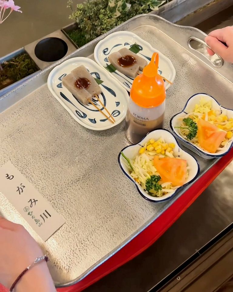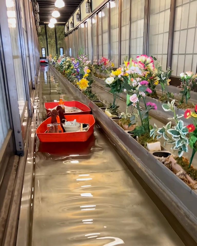 囲炉裏と掘りごたつがある個室で、料理は小舟で流れてくる