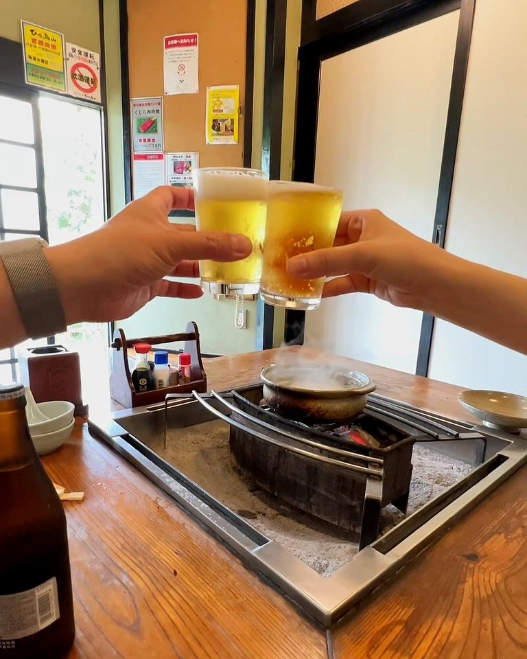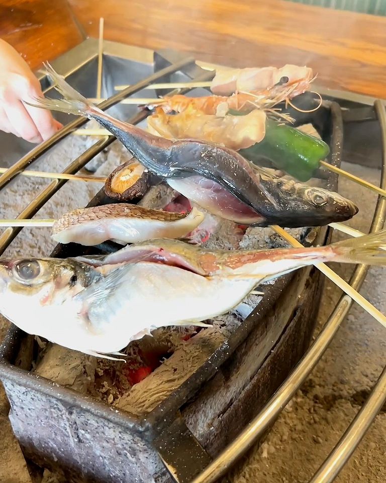 - 名物のとうふ鍋から始まって、たくさんのお肉やお魚の串焼きを囲炉裏で焼きながら楽しめる