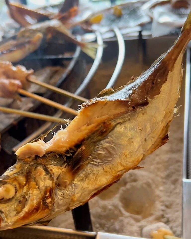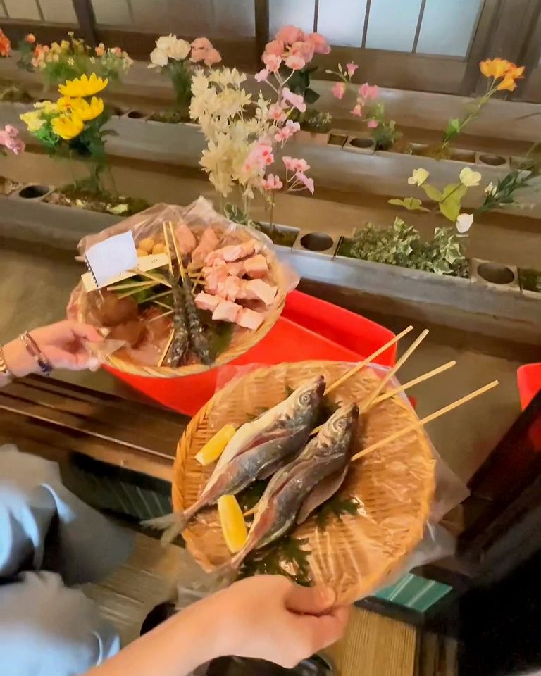 名物のとうふ鍋から始まって、たくさんのお肉やお魚の串焼きを囲炉裏で焼きながら楽しめます。炭火で自分たちで焼きながら食べたら、なんでこんなに美味しいんでしょうか!お肉やお魚が焼ける香りとともに、じっくり焼く楽しみがありました。