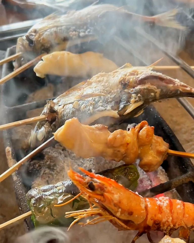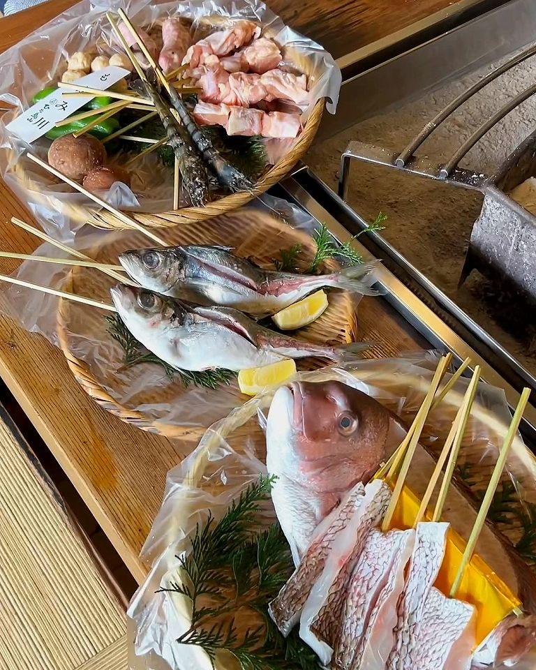 ひな鳥山では追加料理として、「和牛肉串焼」や「鯛の串焼」「あじの刺身」「ジャンボえび駆使焼」なども楽しめます。