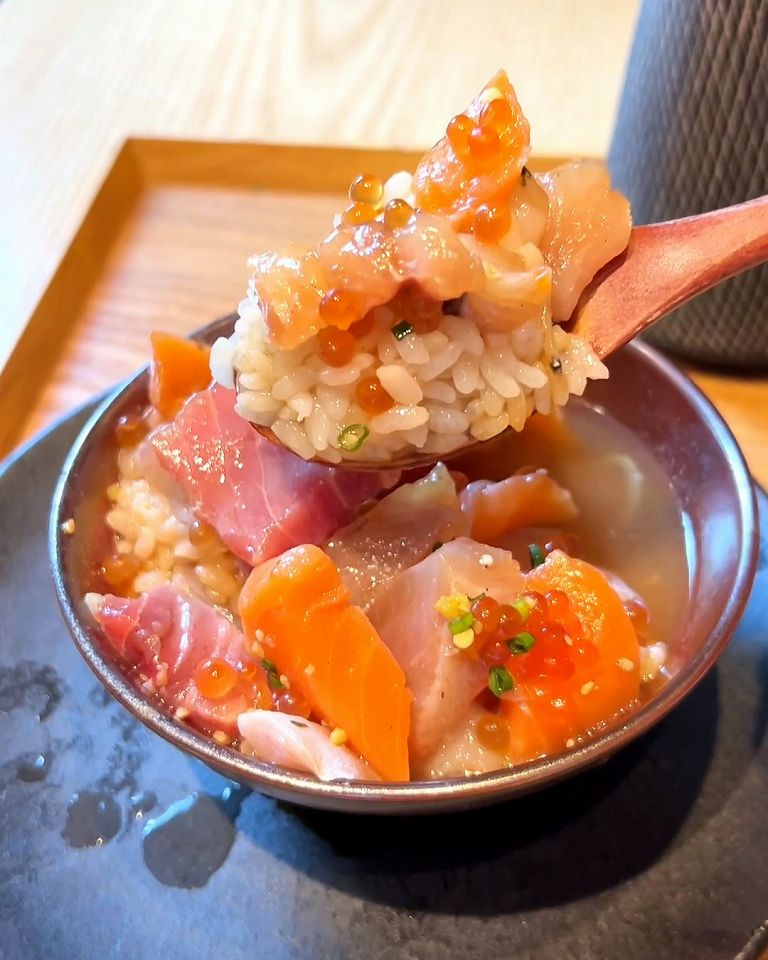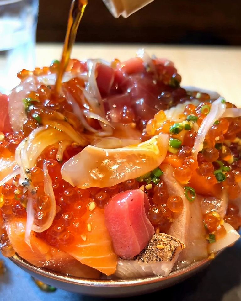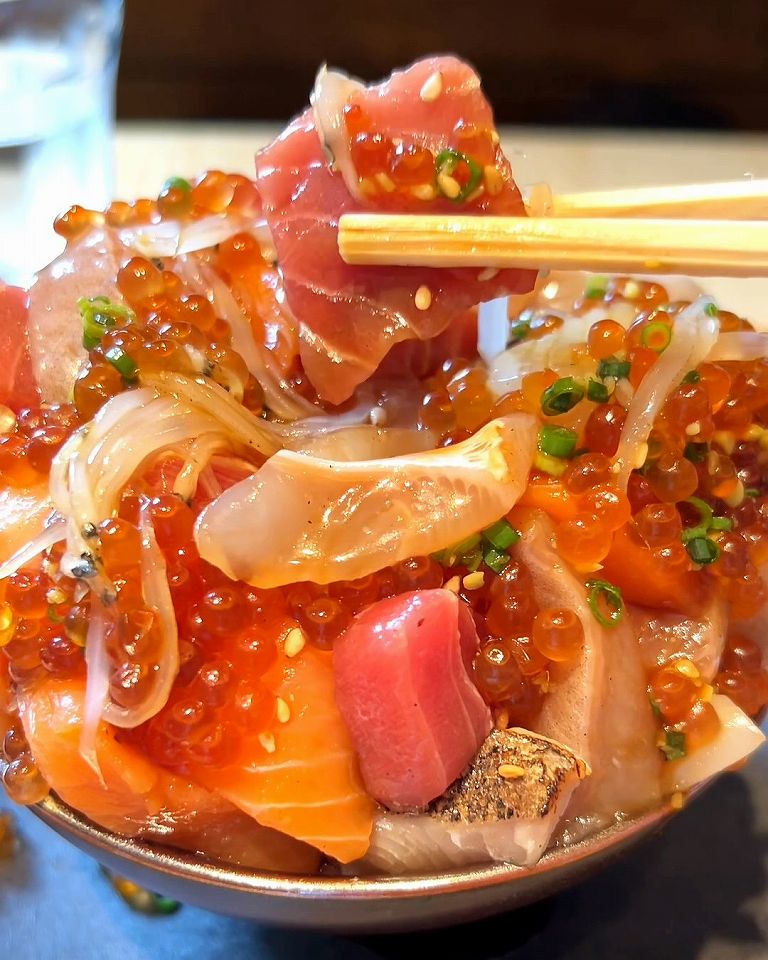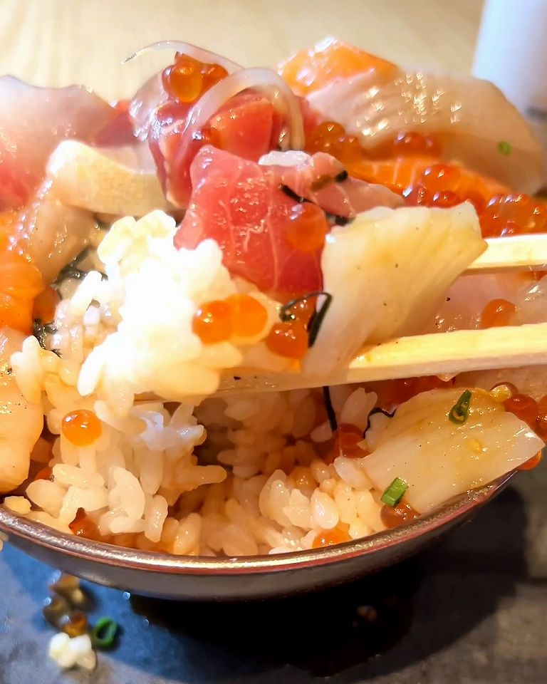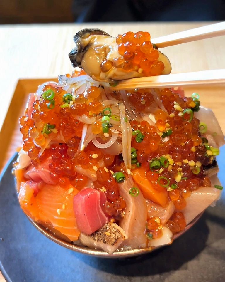 見てくださいこのボリューム!ごはんの上にこれでもかってくらいお魚が盛られていて贅沢すぎます!新鮮な牡蠣や本鮪に、旬なお魚といくらがたっぷりです!一口食べればそれぞれの魚の旨みが口いっぱいに広がってたまりません。