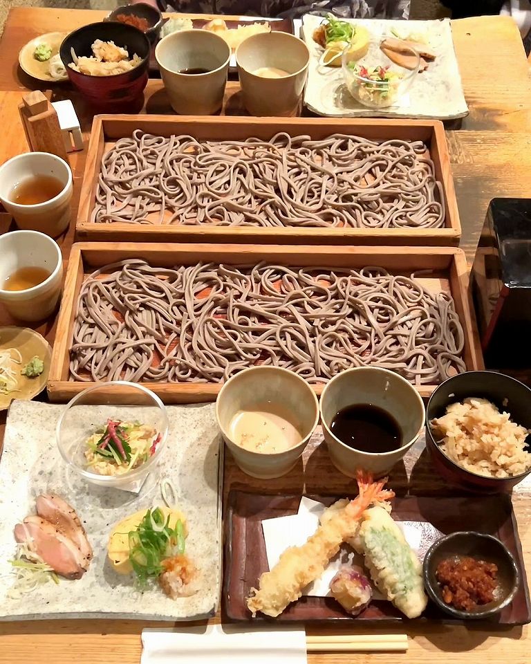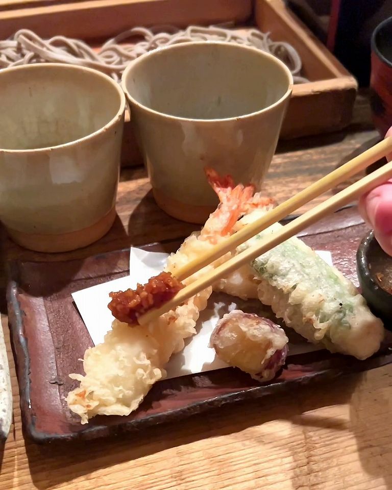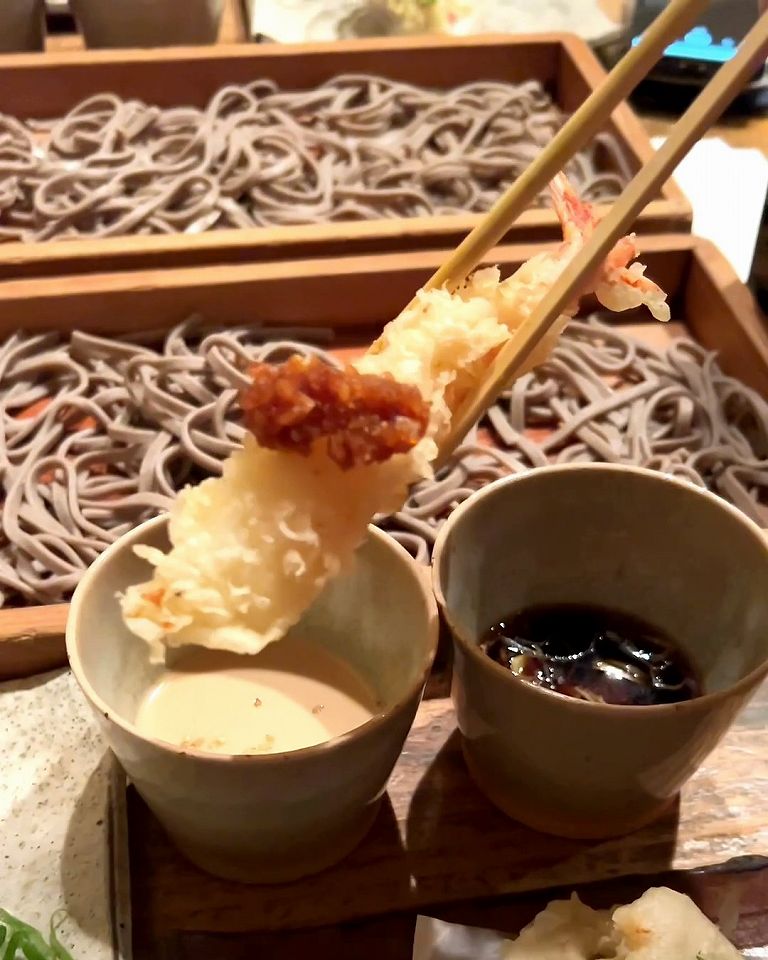 - 蕎麦はお出汁と胡麻ダレの2種類のタレが付いてきて、太くて腰のあるお蕎麦との相性は抜群