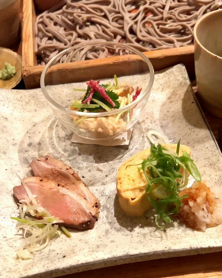板蕎麦 香り家(いたそば かおりや)では他にも、「天ぷらそば」や「たぬきそば」など単品のお蕎麦や、「だし巻き玉子」や「板わさ」「焼き味噌きゅうり」「合鴨焼き」などの一品ものも楽しめます。