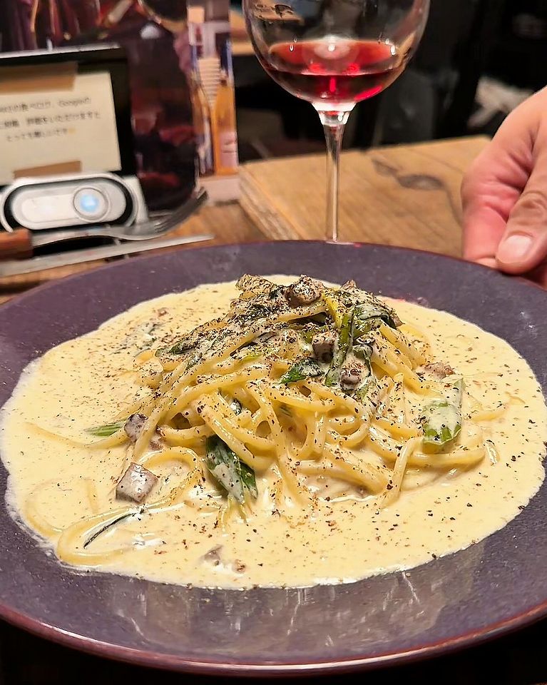 - 最後は鴨肉のカルボナーラでしっかりとまとめてくれた