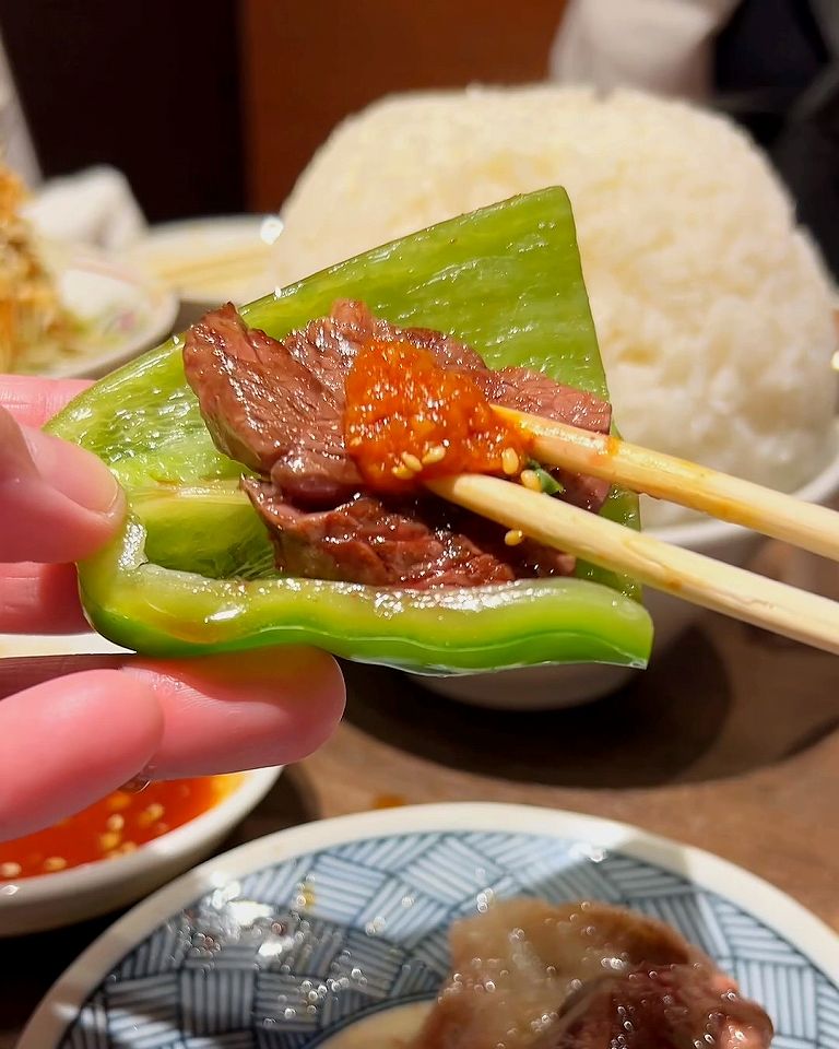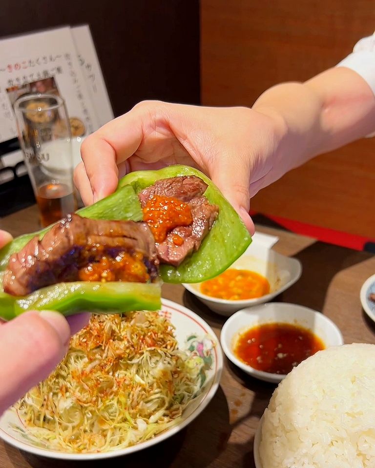 ここはサンチュの代わりに冷えたピーマンで食べるんですが、これが美味しいんです!トマトで食べるのもおすすめです!ピーマンやトマトのさっぱり感とジューシーなお肉の相性はバツグンです。