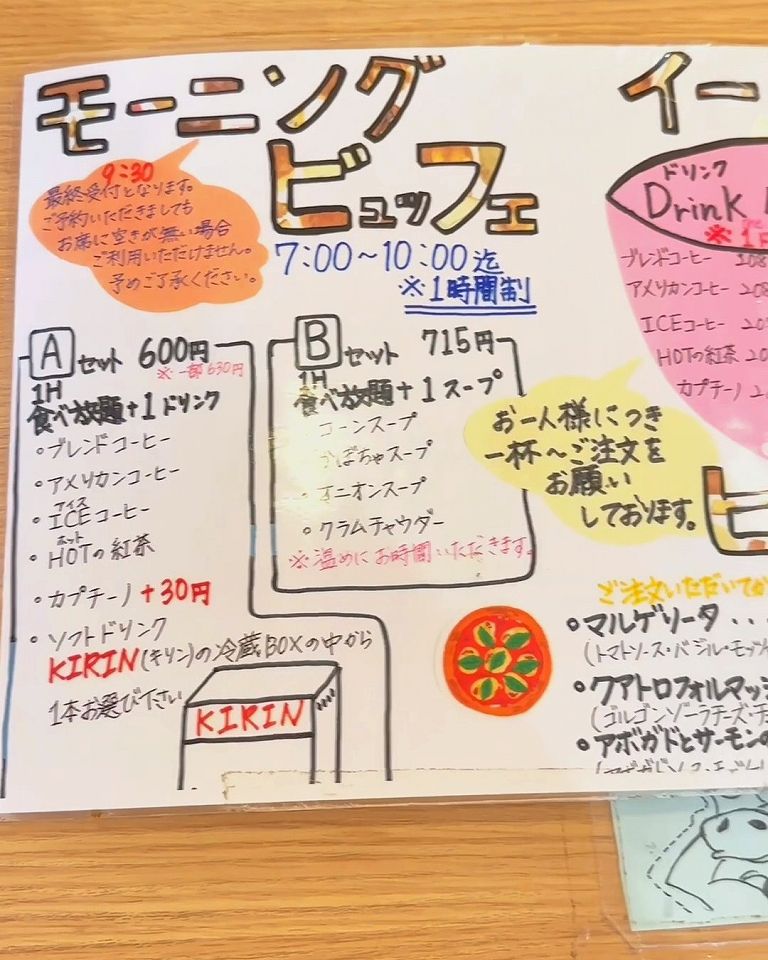 写真では「Aセット 600円」「Bセット 715円」となっていますが、25年9月現在、「Aセット 650円(土日祝は700円)」「Bセット 765円(土日祝は815円)」に変更されたようです。