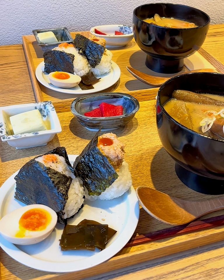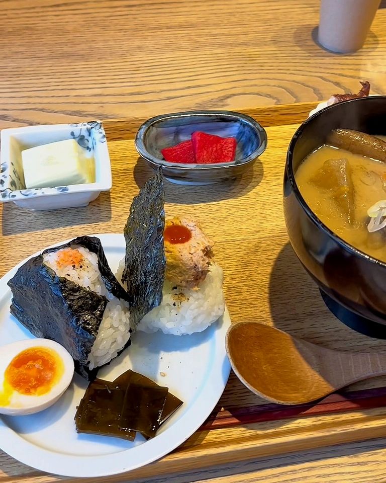 - お味噌汁と、ショーケースの中から好きなおにぎりが選べるセットが人気