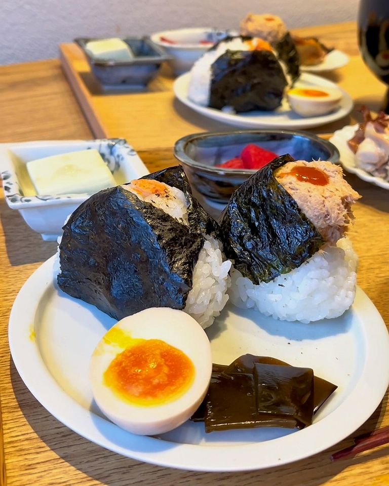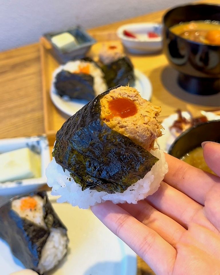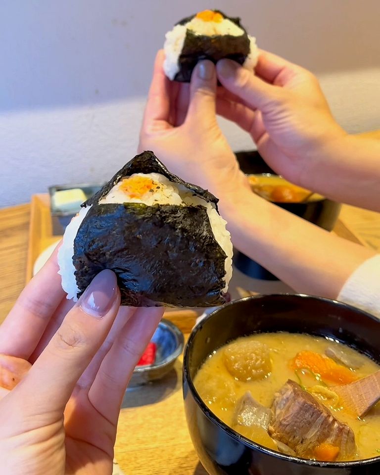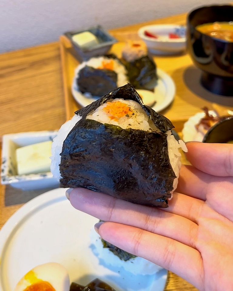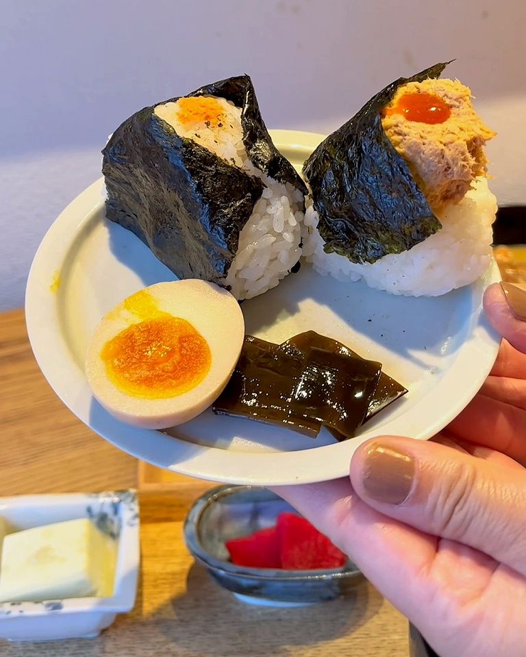 この可愛いおにぎりはお米がモッチモチです。おにぎりは小さめで250円で追加できるからおすすめですよ!モチモチのおにぎりが病みつきになります。