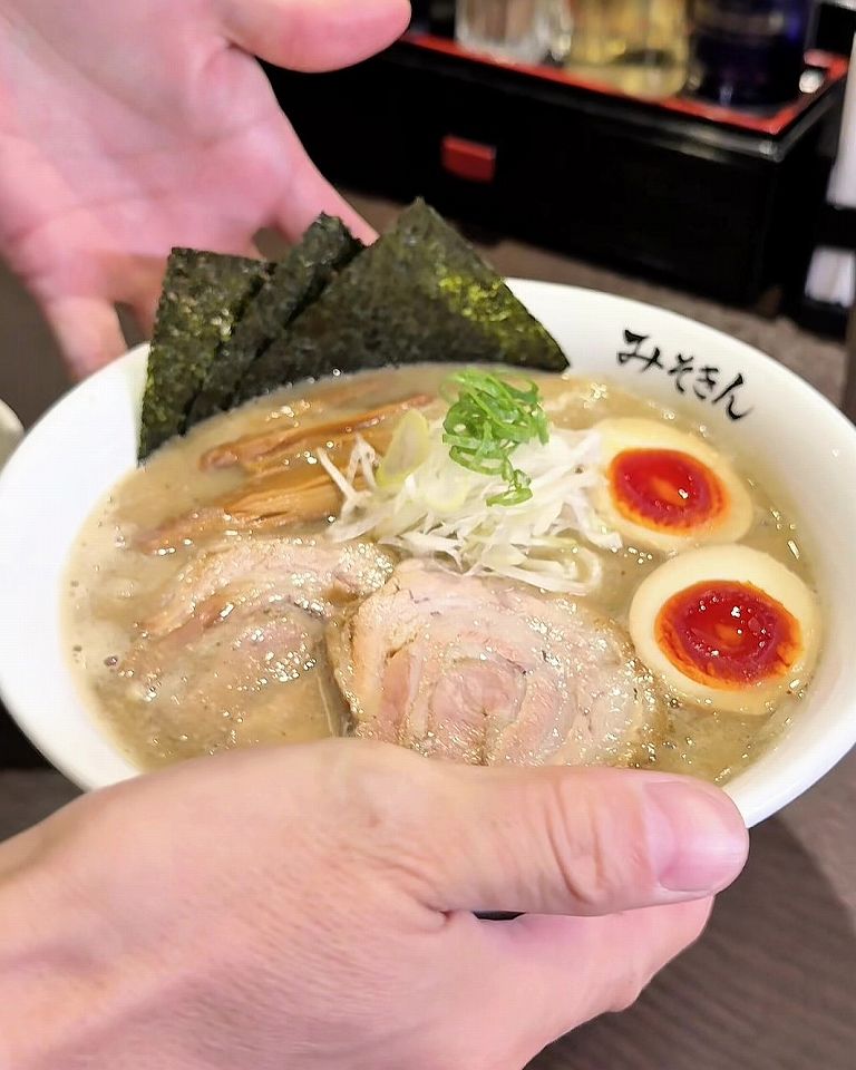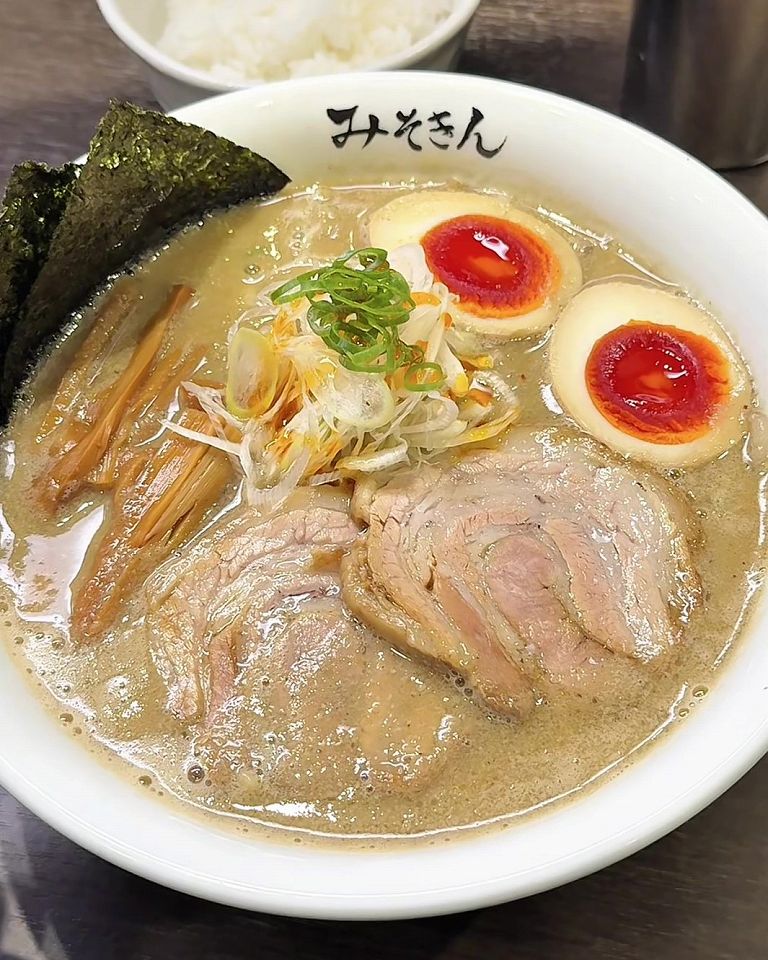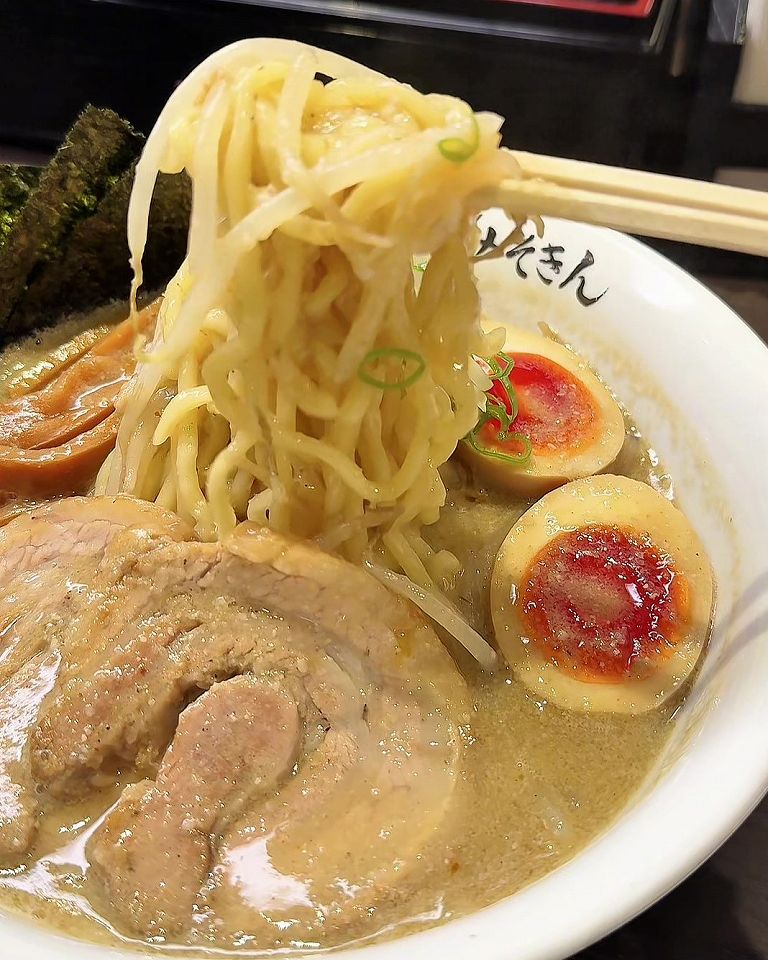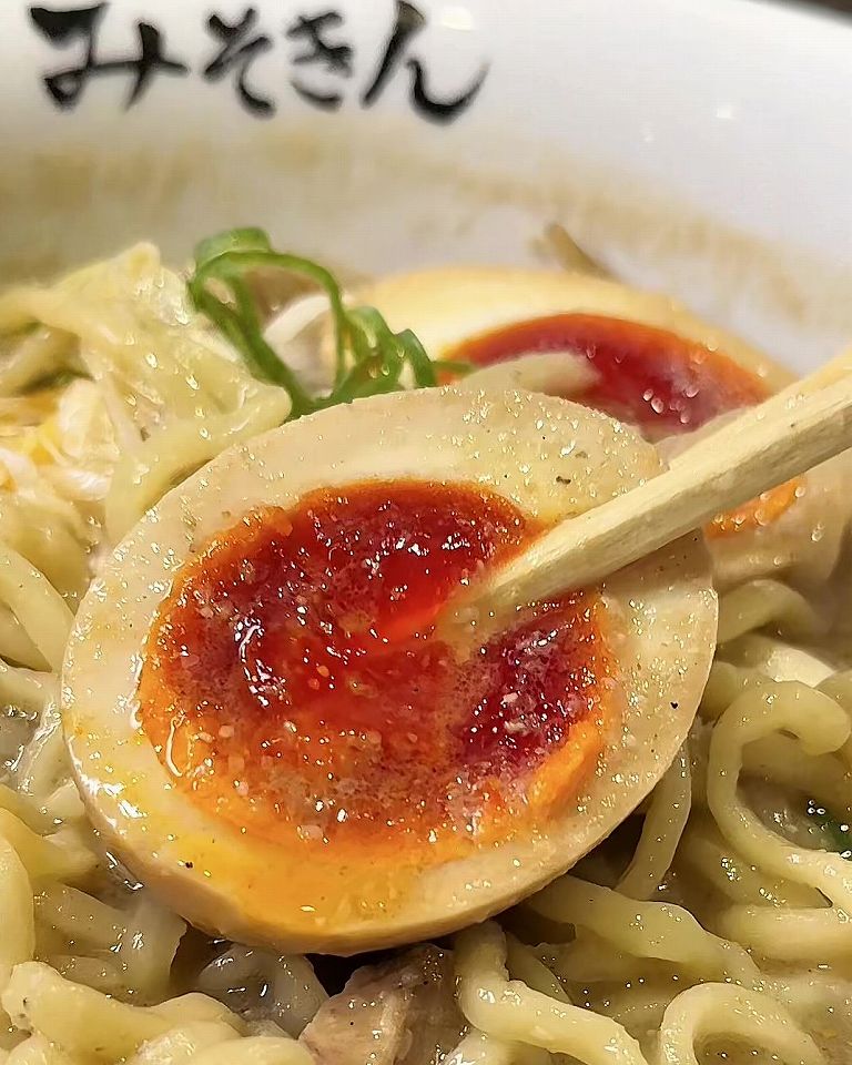 みんなが食べてたのはやっぱり「特製みそきん」です。白濁したスープに色の濃い煮卵、これはもう美味しそうです!スープの深みと旨みが絶妙で、一口飲むと一気にハマります。