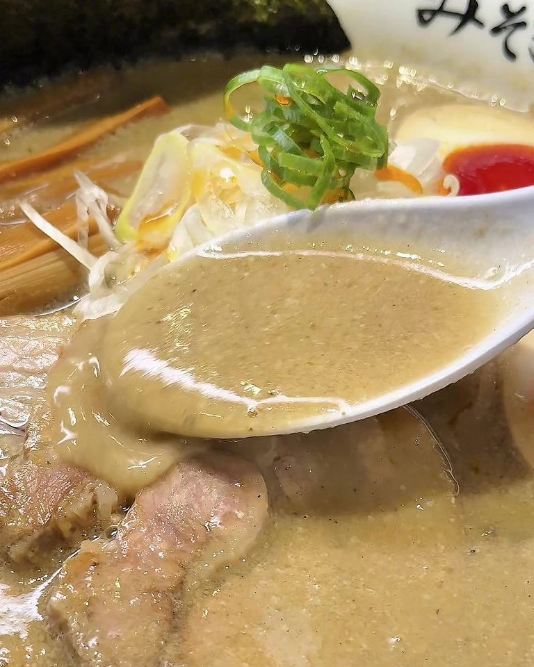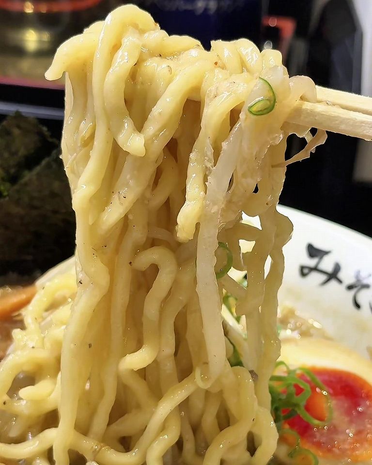 - 豚骨と鶏ガラベースに、白味噌を強く感じる合わせ味噌がまろやかな口当たり