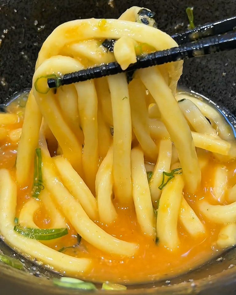 「追い求めたものは「餅」だった」という餅麺の、一番人気「釜玉明太カルピスバターうどん」は色の濃いたまごでとっても美味しそうです。早速食べてみると、この麺は確かにモチモチでグミのような食感です!細いトッポギを食べてるようなしっかりとした弾力を感じます。バターと明太子の香りが食欲をそそり、モチモチの麺の食感がたまりません。
