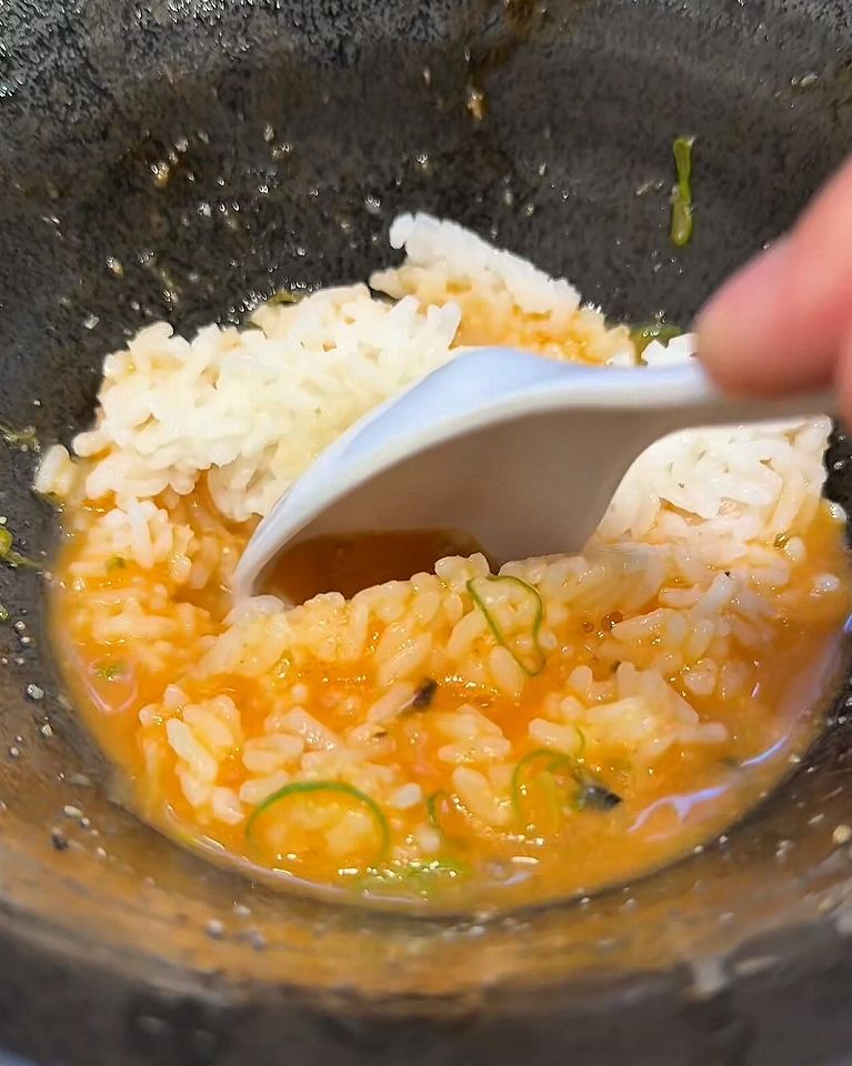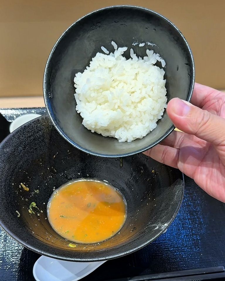 後半は出汁をかけて楽しめて、麺を食べ終わったら、無料でライスがもらえるので残ったスープと一緒に食べることができます。満足感がありますね。ご飯を加えることで雑炊風になり、〆まで抜かりなく美味しく食べ尽くせて最高です。