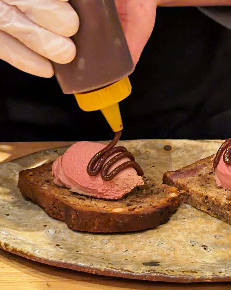 バナナブレッドに乗せたレバームースは、バナナの甘さとレバームースが相性抜群です。