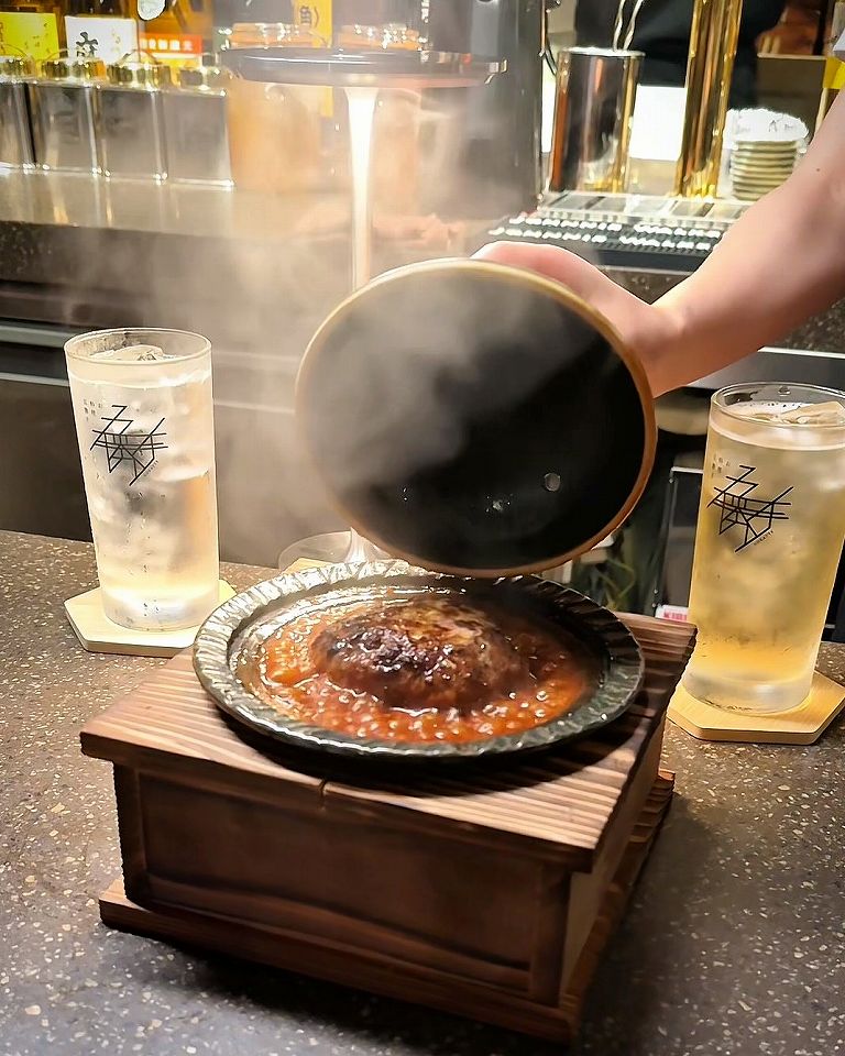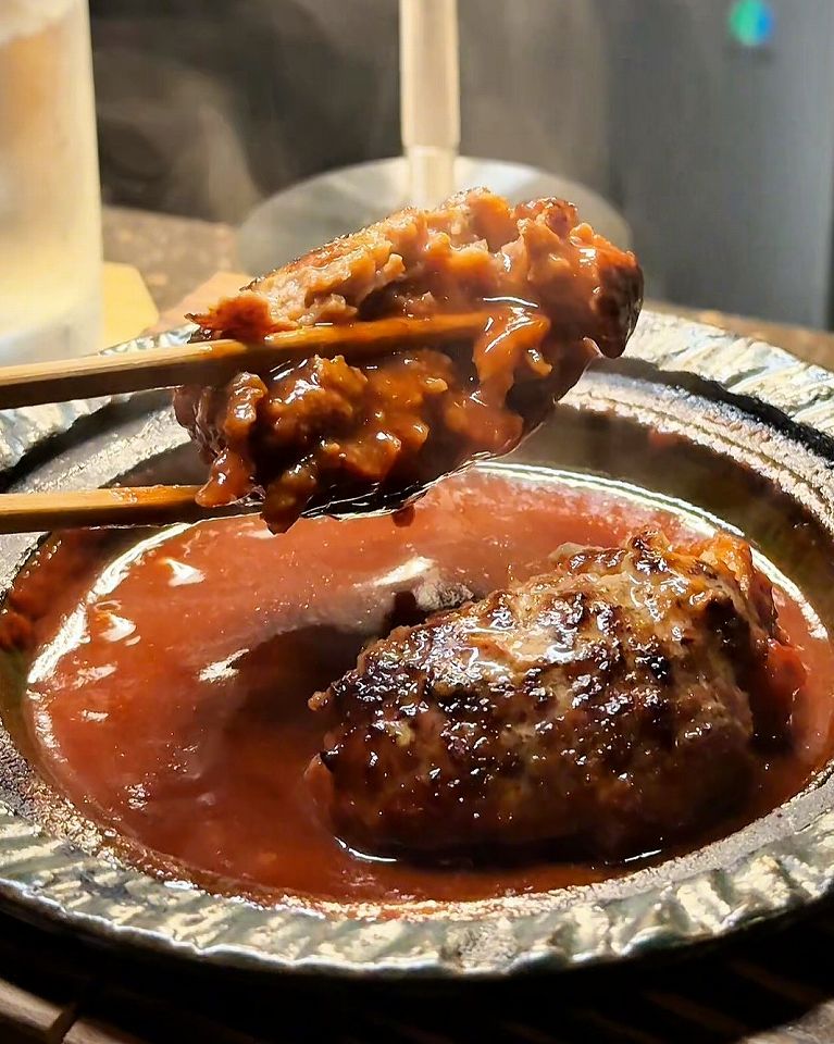 - 薪の香りが宿り味噌と赤ワインでグツグツに煮込まれた超粗挽きの肉バーグ