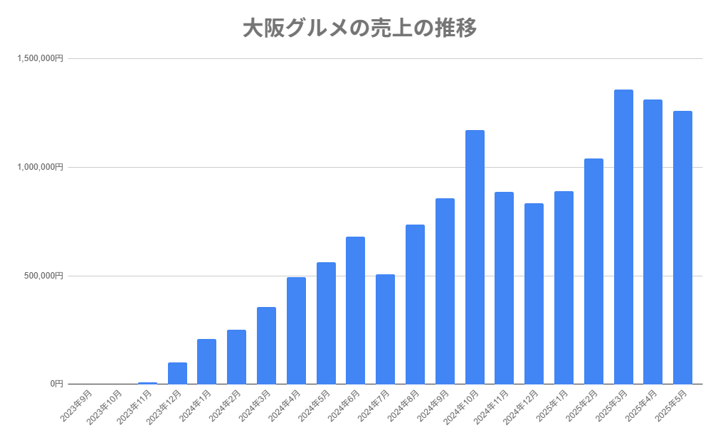 そして、大阪グルメの始動からおよそ1年9ヶ月の間の総売上は約1,360万円を達成しました。現在も右肩上がりで売上を伸ばしています。
