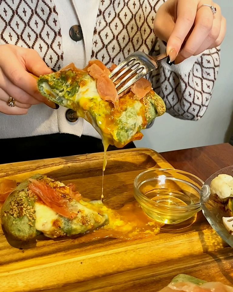 ここのランチで食べられるのがこの包み焼きピザです。トマトやゴルゴンゾーラなどを選べて、外はカリカリ中はトロトロでチーズがとってもジューシーです!生地の香ばしさとチーズの濃厚さがぴったりでした。生地は最後までモッチモチでめちゃくちゃおいしいです!