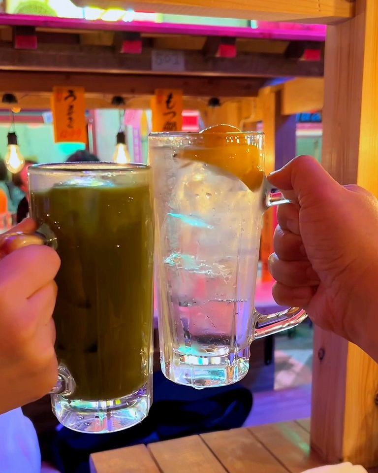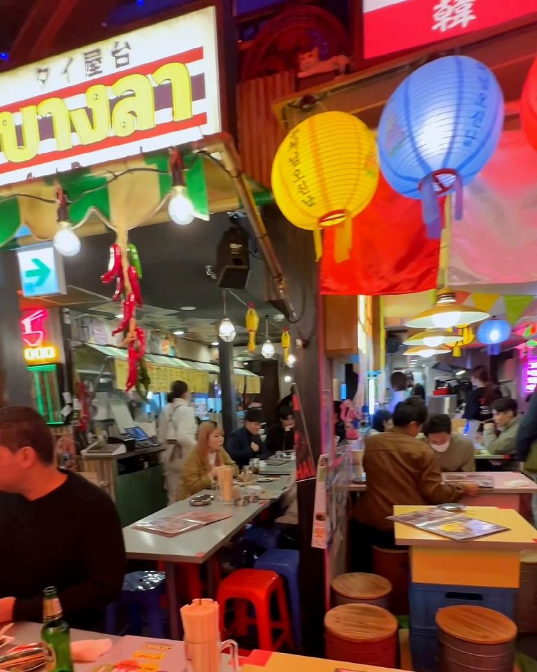 地下は特にカオスで、見てくださいこのエモい雰囲気!タイ料理や韓国料理、和食の居酒屋もあって、来てからゆっくりお店を選ぶのも楽しいですよね。カジュアルで賑やかな空間は、友達とワイワイ楽しむのにぴったりです。