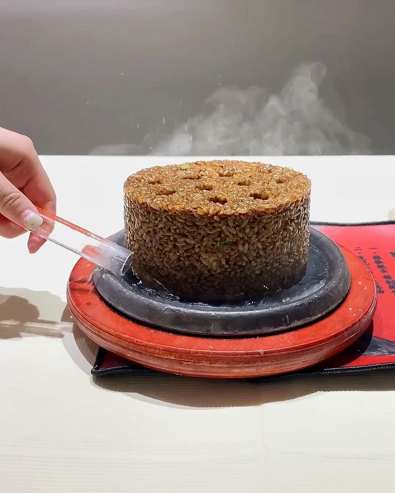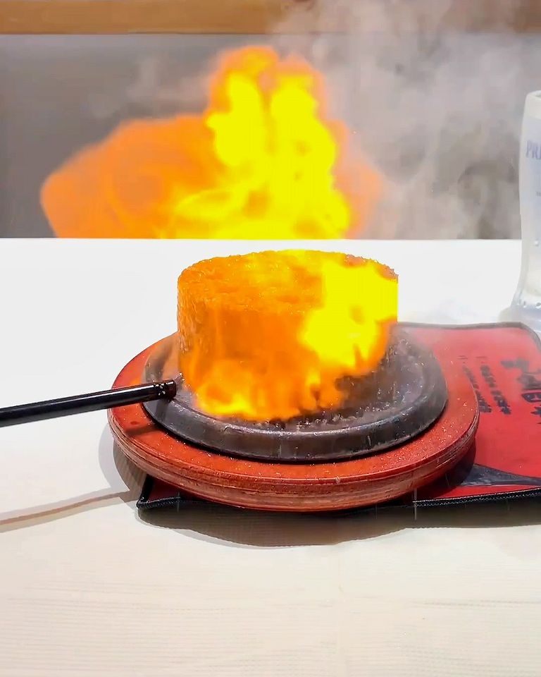 - チャーハンの周りにラム酒を注いで火をつけたら、大迫力の火柱が上がる