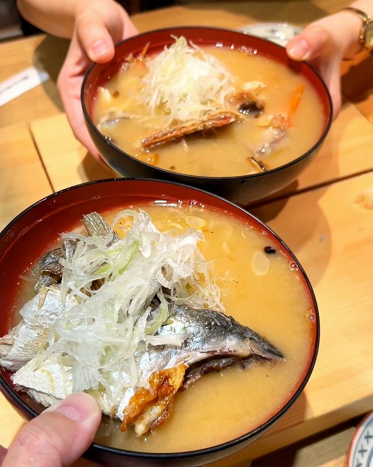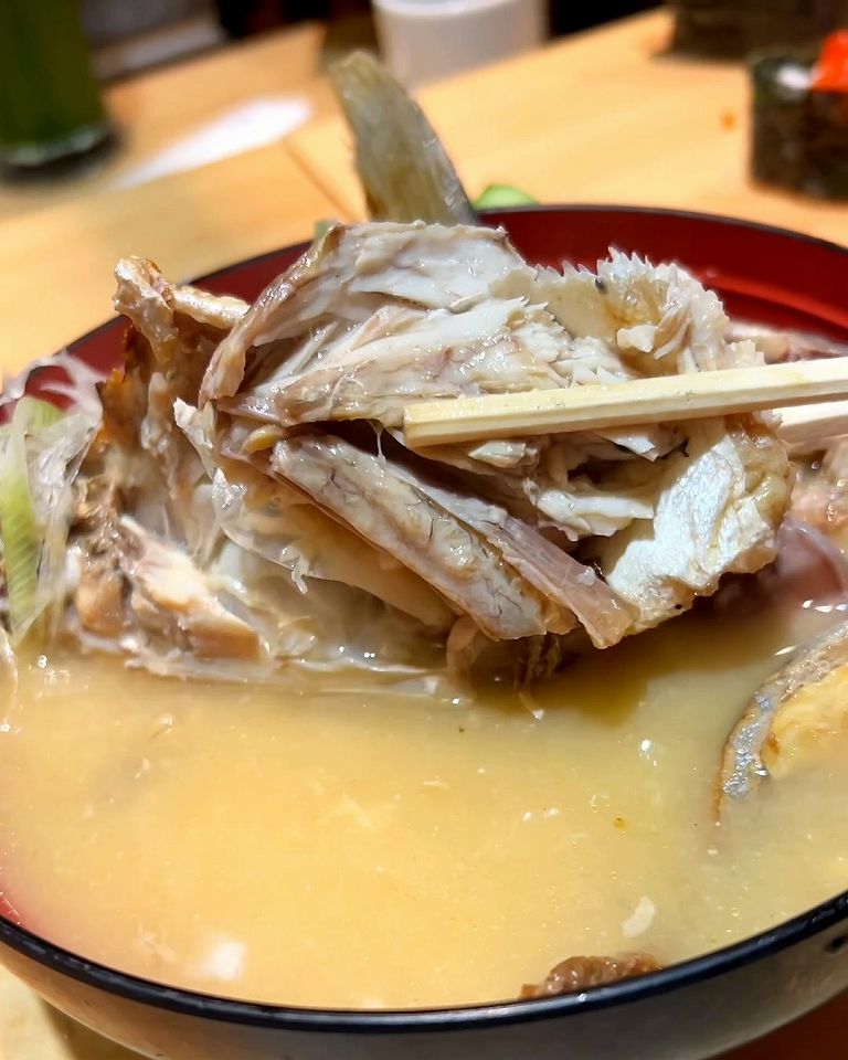 お寿司以外ではこのあら汁がおすすめで、びっくりするくらい身がたっぷりです。身がほろほろとほどけてスープに溶け込み、最後の一滴まで楽しめます。