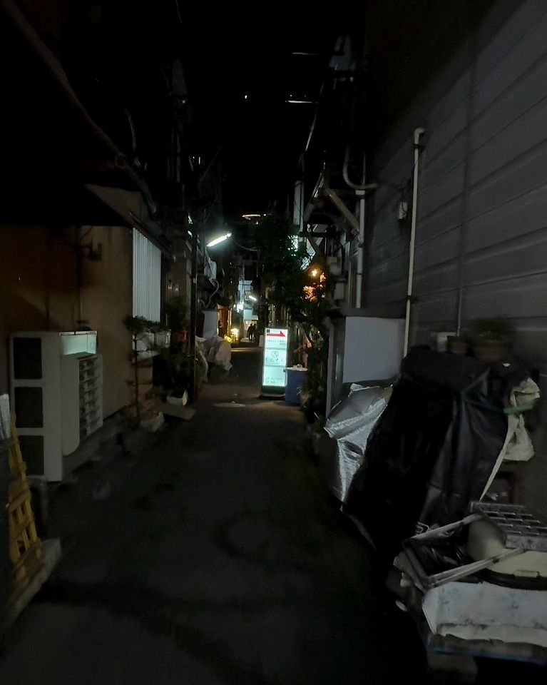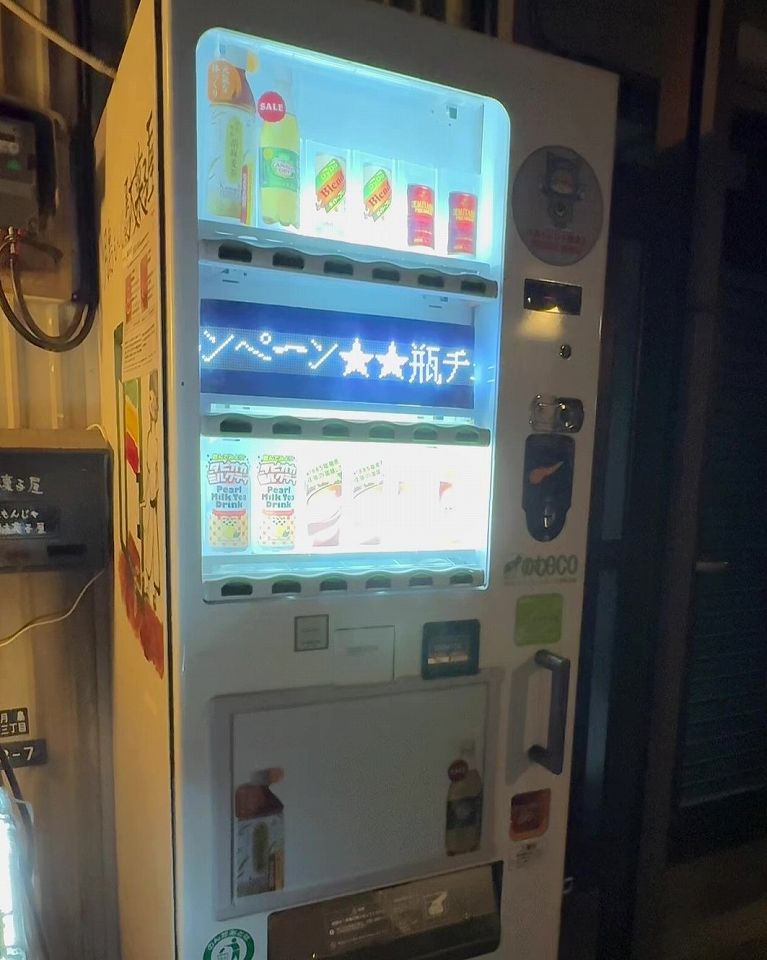 文房具屋さんの脇の真っ暗な細道をずっと進むと、暗闇に目立つ自販機があります。