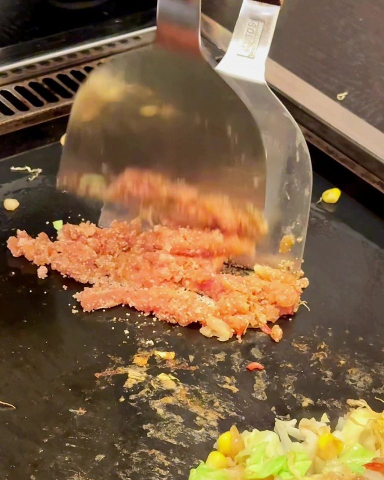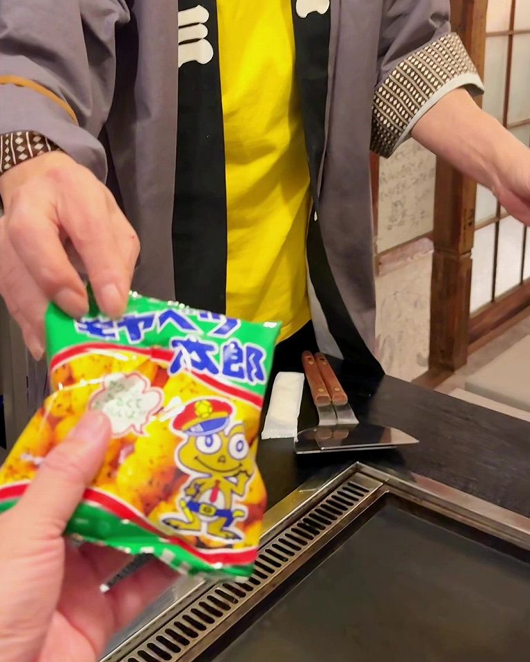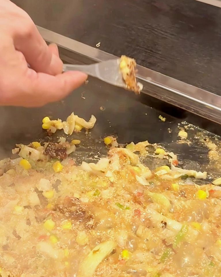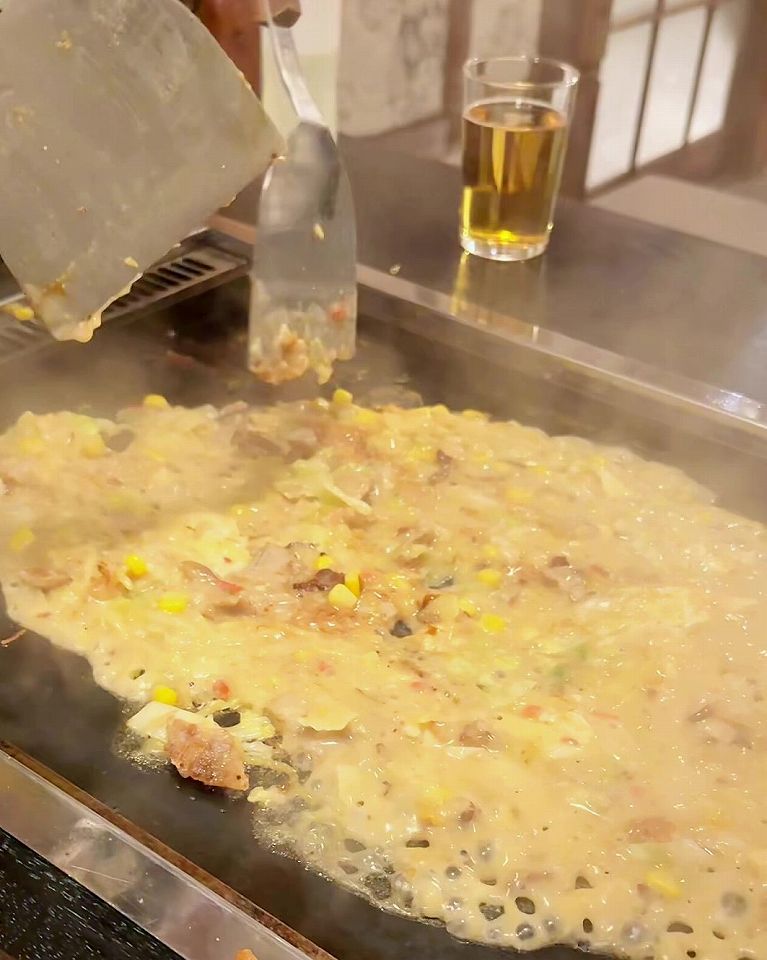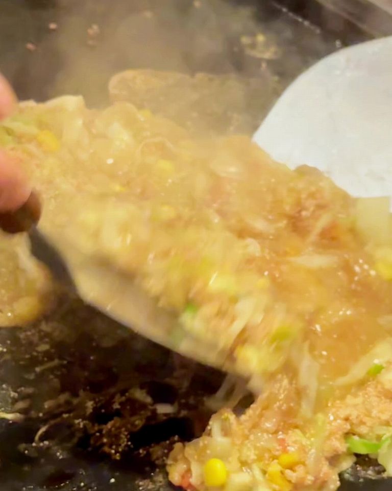 これはチーズともんじゃが一体になるまで、お父さんが丁寧にチーズを溶かし続けて焼いてくれます。