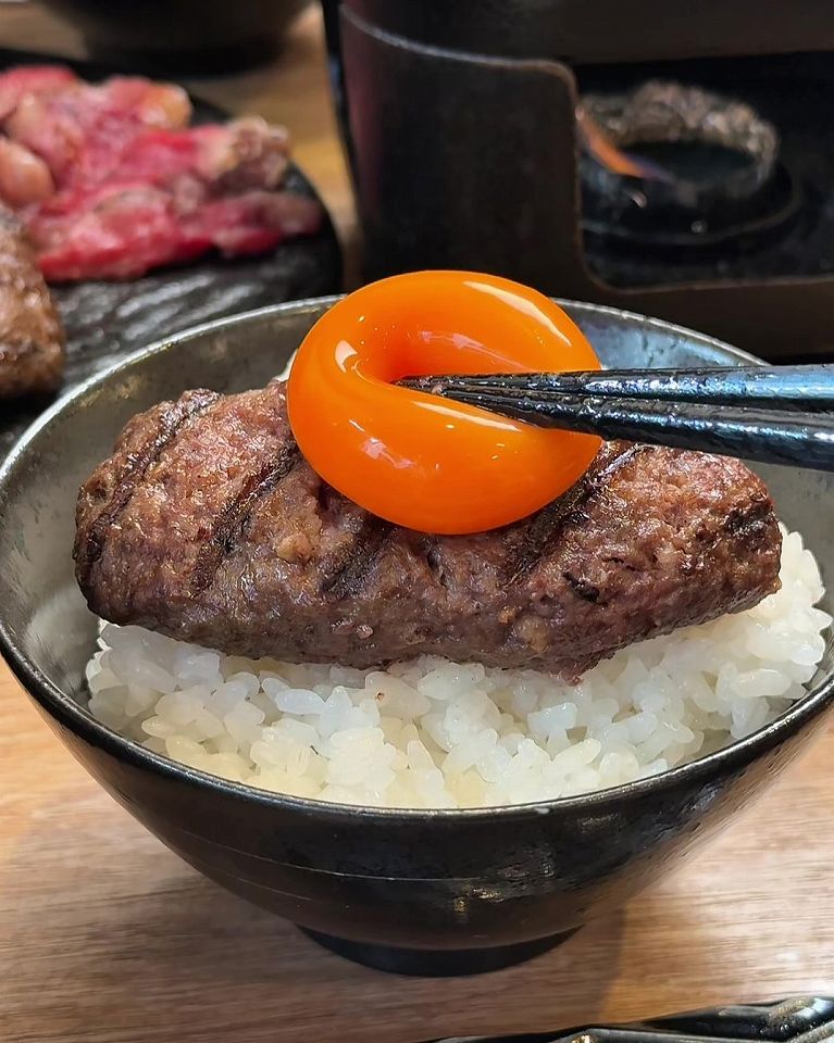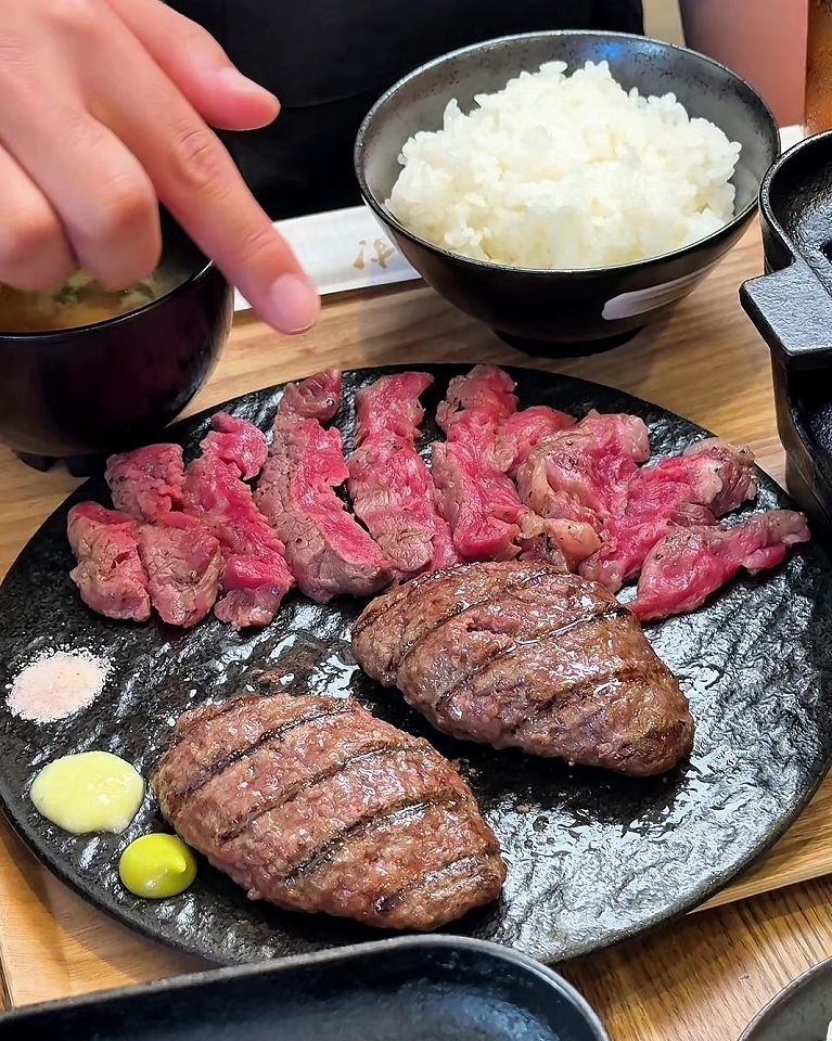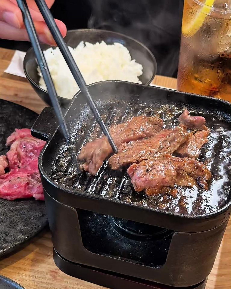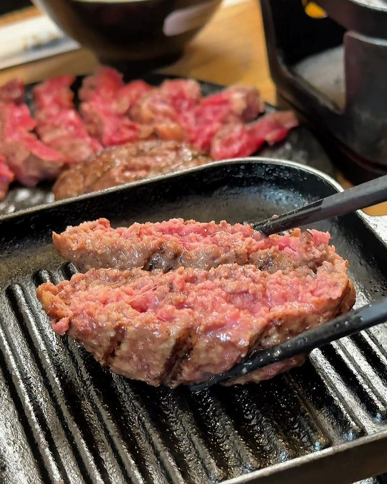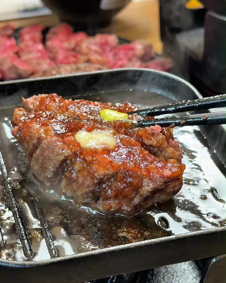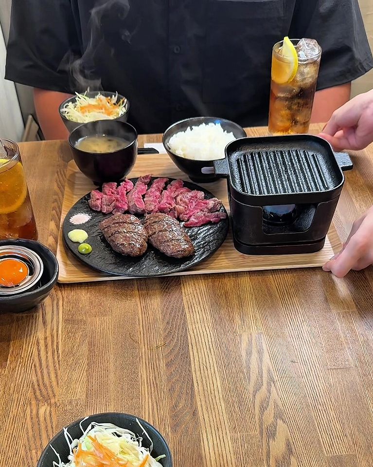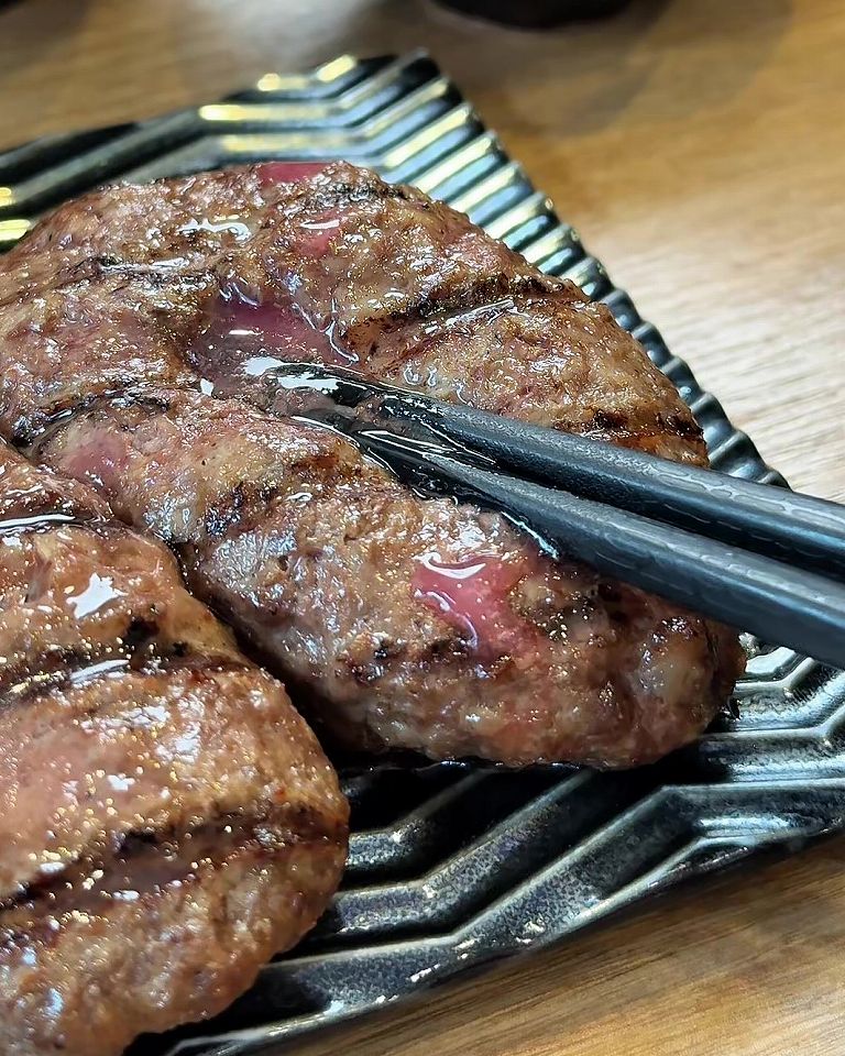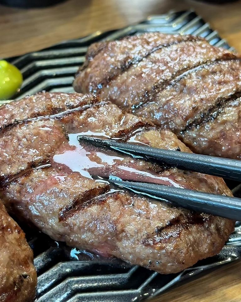 見てください!このたっぷり閉じ込められた肉汁!鉄板も提供されるから常に熱々の状態で楽しめます。肉汁が弾ける瞬間、炭火の香ばしさがふわっと広がります。