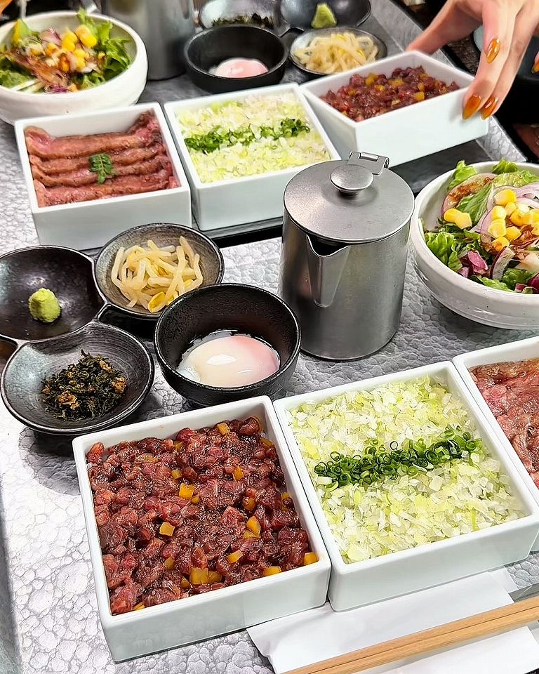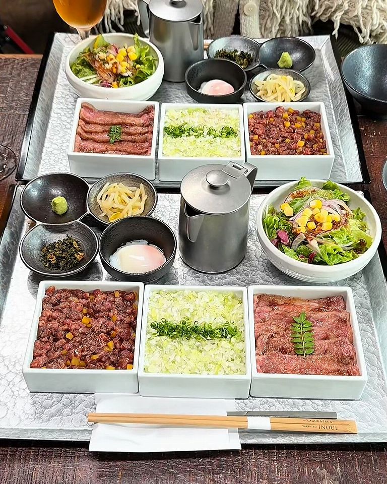 - 神楽坂で人気の「焼肉いのうえ」が提供している、贅沢和牛の3段重ねひつまぶしランチ「INOUE三重奏」