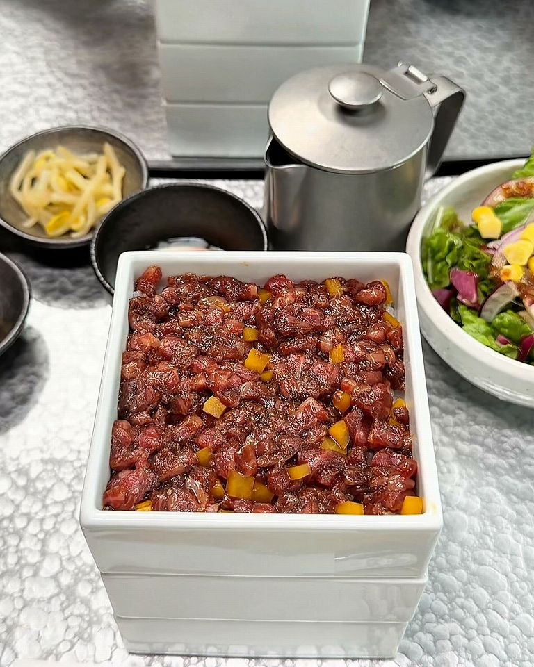 1段目は黒毛和牛の贅沢ユッケ