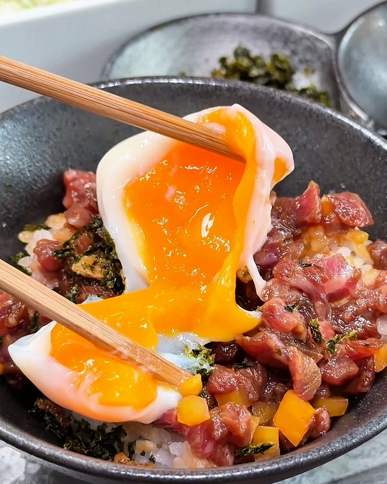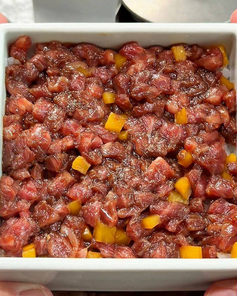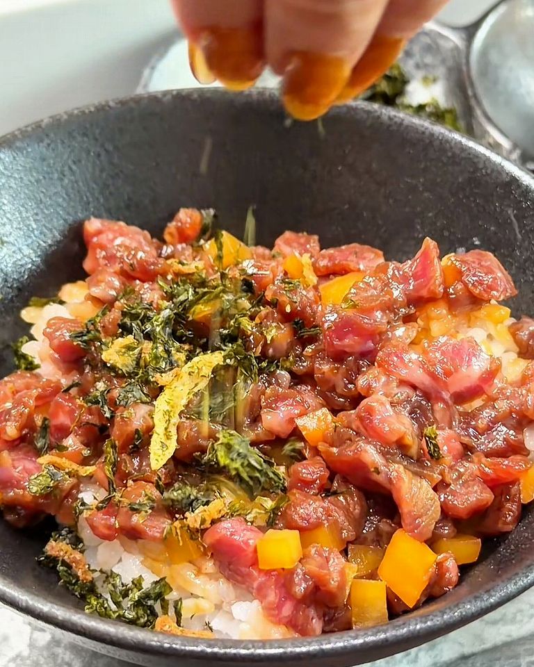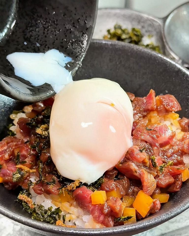 「INOUE三重奏」はお肉ひつまぶしランチで、上から黒毛和牛の贅沢ユッケがこんなにたっぷり入っています!