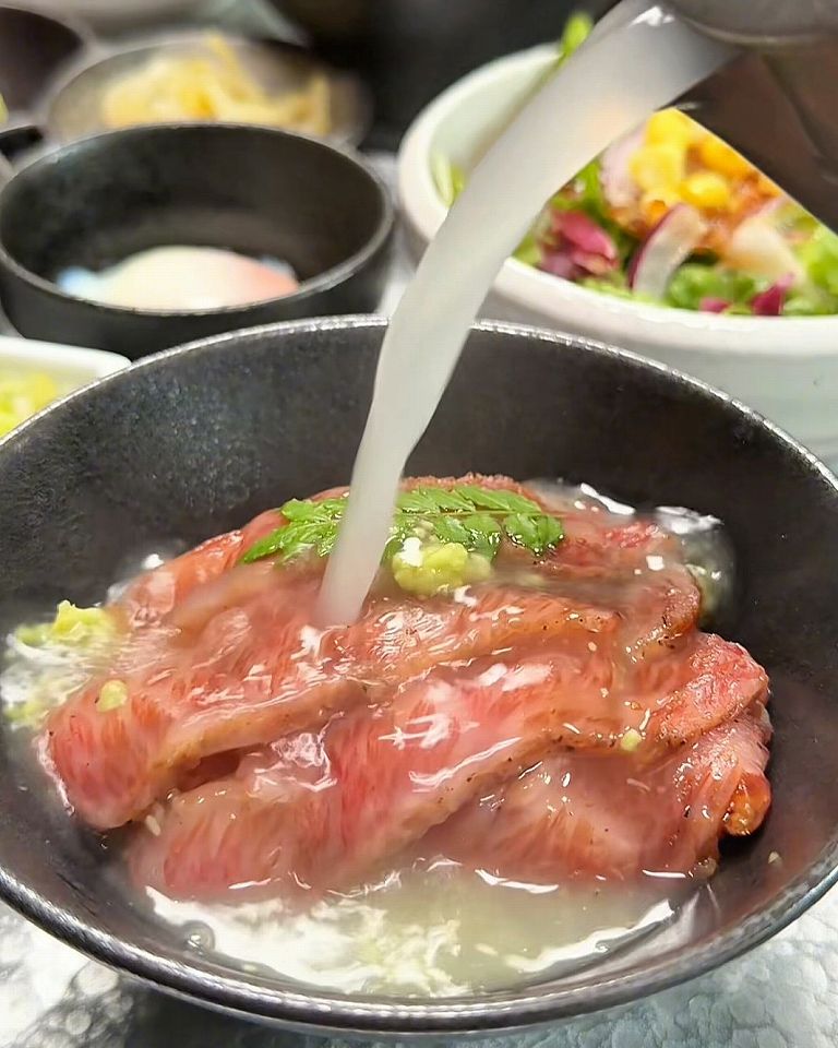 - 2段目は黒毛和牛の三角バラ肉。一口食べてから、残りは美味しい出汁でお茶漬けがおすすめ