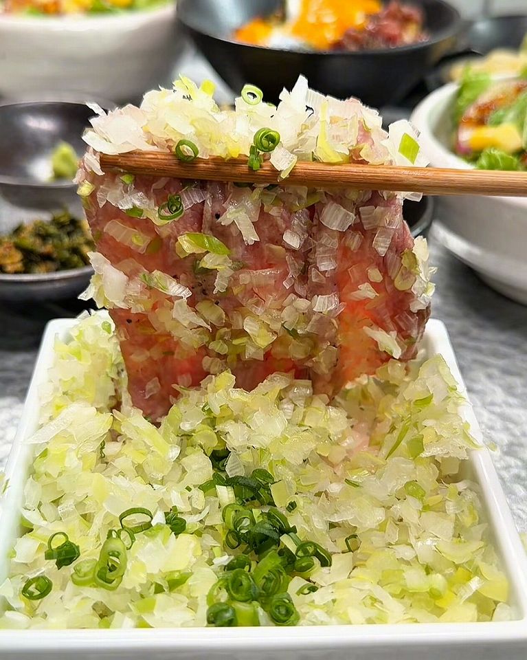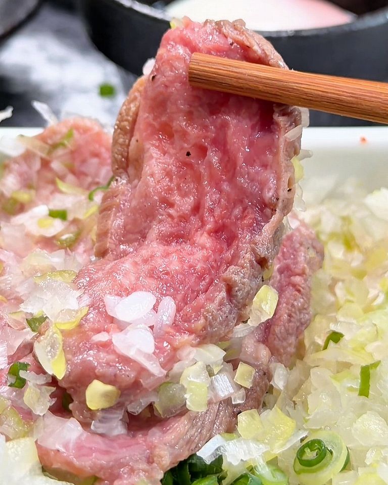 - 3段目はネギの下からたっぷりの牛タンが出てくる