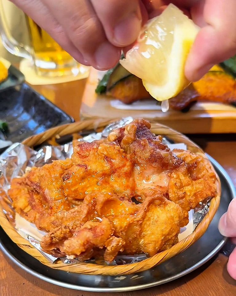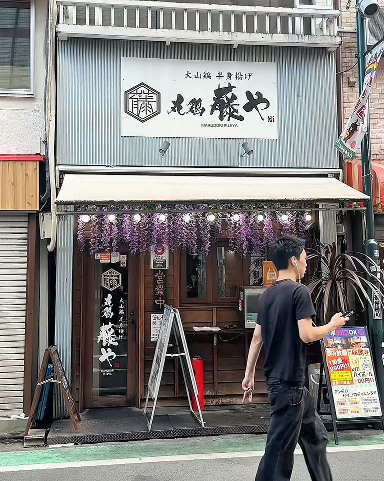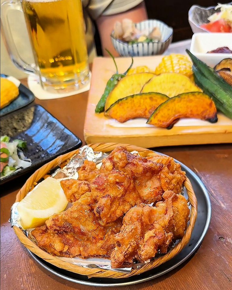 まずは「丸鶏 藤や」、鶏肉好きに刺さるお店で、低温調理の白レバーや出汁に漬け込んだザクザク唐揚げをいただけます。鶏肉の旨みを最大限に引き出した料理ばかりで、どれを食べても間違いなしです。