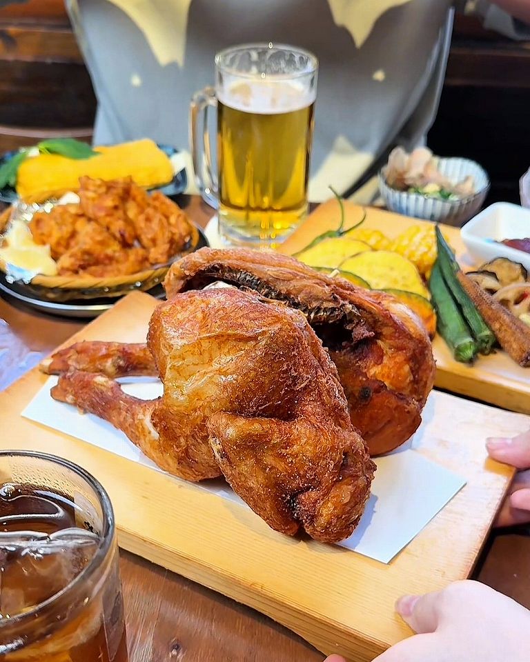 メインは大山どりの雛鶏の「大山ひな丸鶏揚げ」です!見た目も豪快で、香ばしい香りが食欲をそそります。
