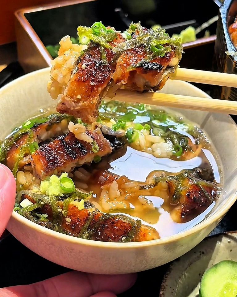ひつまぶしが最高に美味しいから食べてみてください!わさびとネギ、刻み海苔に出汁を加えて、まさに至福のひつまぶしです。