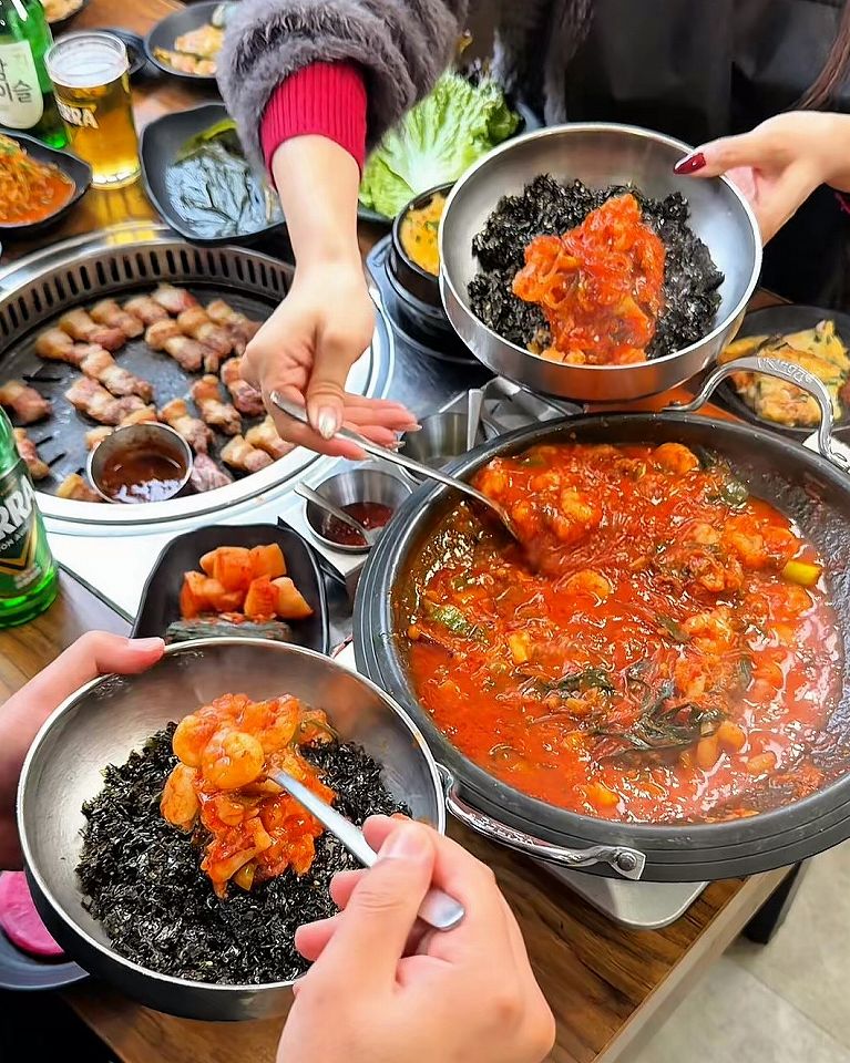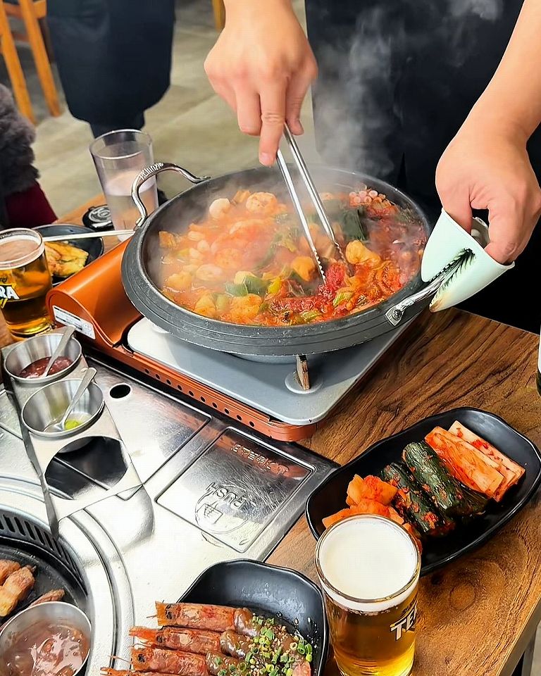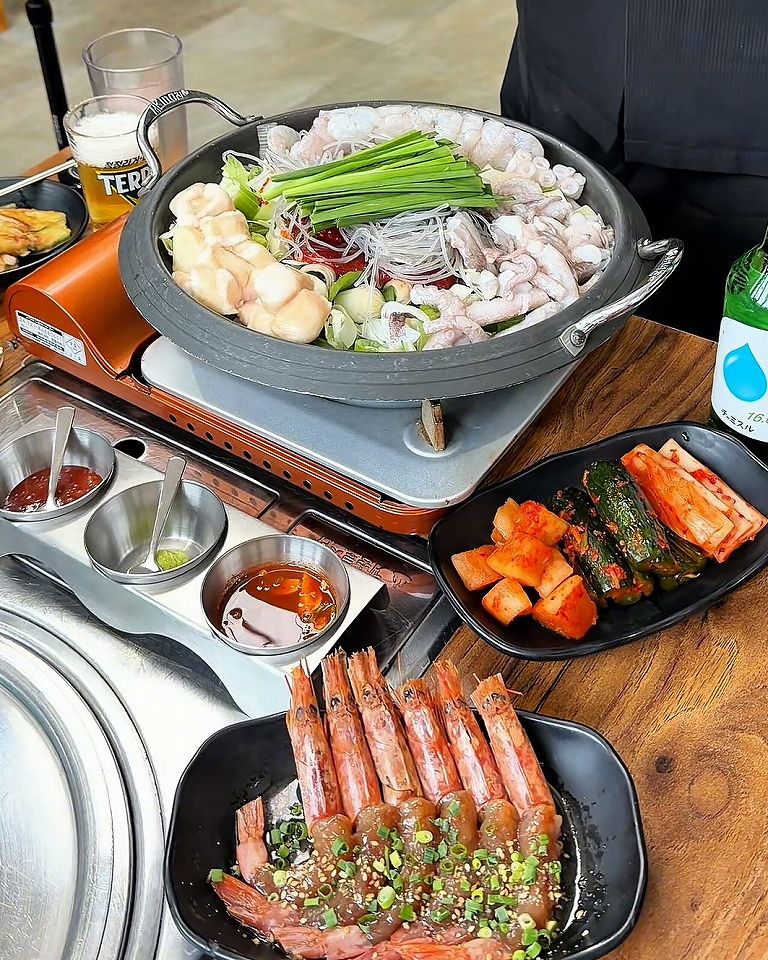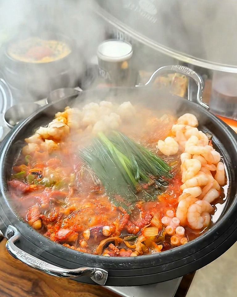 プリプリのタコ、牛ホルモン、エビが甘辛く煮込まれたお鍋は、ご飯に合わないわけがありません。